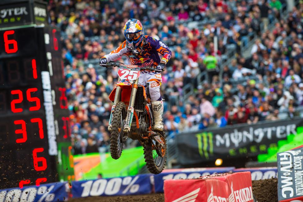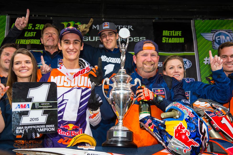 Red Bull KTM has collected two of three titles up for grabs this year in Monster Energy Supercross, with Marvin Musquin now joining Ryan Dungey with his 250SX East Championship. Did you know Musquin and Dungey are the same age? Did you know they train together with Aldon Baker? You did know they’re teammates and friends. Overall, one heck of a season for this duo. Marvin talked about finally getting a supercross title after the race.