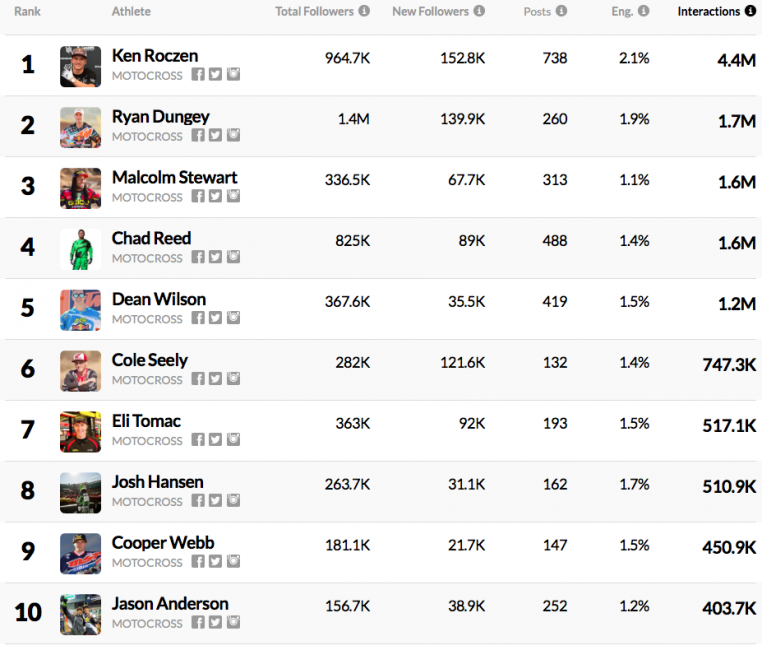 Whew! After sixteen races over seventeen weeks, Monster Energy Supercross will come to a merciful close Saturday night in Vegas. With all three championships on ice, there isn’t much to look forward to other than the East and West Regions squaring off. The guys at Hookit have tracked supercross athletes from January 1 until April 27 across Twitter, Instagram, and Facebook, and Ken Roczen came out on top. The German superstar, with worldwide appeal, had 4.4 milliion intereactions during that time. Ryan Dungey, 450SX champ, was a distant second with 1.7 million. Malcolm Stewart was third with 1.6 million. The rider that impressed us? Dean Wilson, who barely got to race this year and still held onto the top five. Check out the rest of the top ten below.