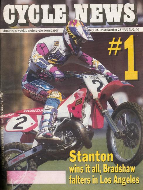 We've written many times about the 1992 Los Angeles Superbowl of Motocross, which was the final round of the '92 AMA Camel Supercross Championship. Yamaha's Damon Bradshaw, then 19, had a sizable points lead until he threw it away at Indianapolis, letting Team Honda's Jeff Stanton and Jean-Michel Bayle, the defending champion, back in the chase. Then Bradshaw got the lead back with a sweep of the Pontiac doubleheader, putting him 6 points ahead. One week later, Damon tangled with old nemesis Jeff Matiasevich in Las Vegas and lost the lead again to JMB, who quite honestly didn't seem too interested in winning another title—he already had his heart and mind set of moving into road racing. But then Bradshaw won Dallas and San Jose to take back the points lead, as Bayle crashed and injured his shoulder, finishing ninth. At that point, with one race to go, Bradshaw had a 6-point lead on Stanton, but then the last race in Los Angeles was postponed for one month due to the Rodney King riots in LA (just like the Baltimore Orioles had a couple of baseball games postponed this week due to civil unrest). When the race finally happened, Bradshaw seemed to let the pressure get the better of him, locking up and barely being able to get through the whoops while Stanton ran off and hid with the win and a stunning third AMA Supercross Championship in four years.