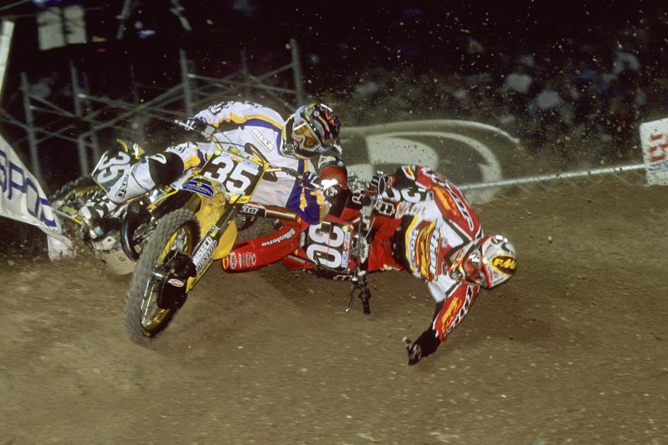 Our own David Pingree, then with Suzuki, was 9 points ahead of Shae Bentley with two rounds to go in the 125 West Region SX Championship in 2000, despite getting caught up in several first-turn crashes along the way. At the penultimate round in Minneapolis, he again got caught up in a first-turn crash, this time bending his front brake rotor. He finished fifteenth, handing a 10-point lead to Splitfire/Pro Circuit Kawasaki's Bentley. Incredibly, Pingree crashed in the first turn again at the series finale in Dallas, only this time Bentley went down too, as did more than half of the entire pack—fifteen all together—in what Cycle News' reporter Dave Deringer described as, "one of the worst first-turn crashes of all time." Then Bentley crashed again, this time with Travis Preston. Ping rode as hard as he could and reached second place, enough to clinch the title had Bentley stayed back in ninth where he was with two laps to go. Bentley dug in, passed Rodrig Thain and Jiri Dostal, and captured the title by 2 points over Ping.
