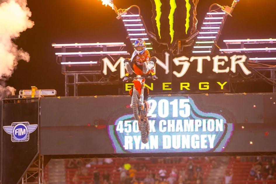 There were basically four players for the win coming into this one, and only three of them made it to the night show. Cooper Webb could have been a foil for Marvin Musquin in the 250 Shootout, but he crashed and hurt his ankle in practice, ending his night (we did talk to Webb and he thinks he’ll be okay for the National opener at Hangtown in two weeks). With Webb out, there was no one to stop Musquin, who cruised to the shootout win and worked on his whips and heel clickers. In the 450s, Eli Tomac was the foil for Ryan Dungey, and they went at it. The first lap of the main saw both going wide open in the high speed Monster Alley, swapping the lead. “That was a blast,” said Tomac. Tomac was on the inside and made the pass, but he lost the back end of his bike and Dungey got back around. Tomac seemed to settle in for the long haul, but then crashed a few laps later. After that, Dungey had a win and could do a heel clicker of his own.