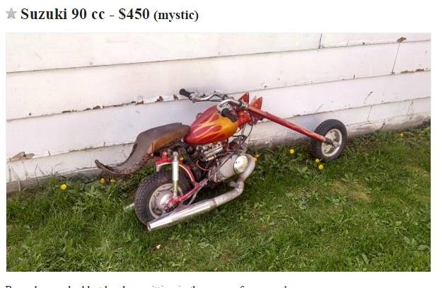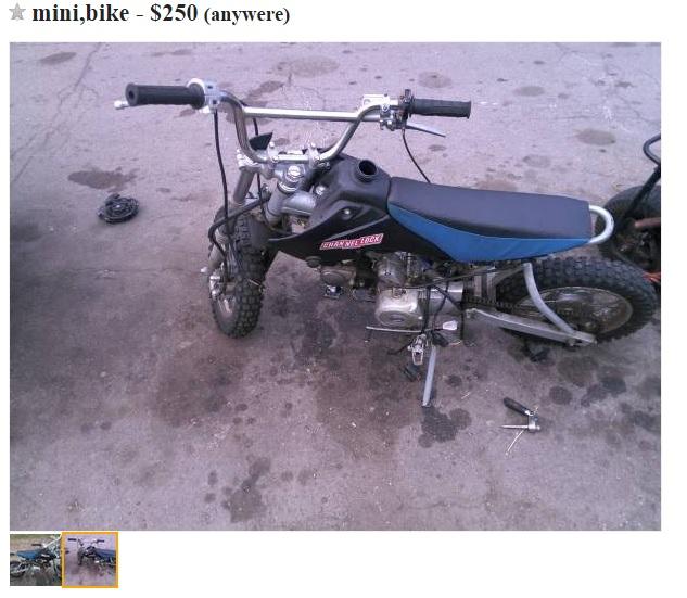 As in, you’d have to be even more bat-crap crazy than the seller of the above mash-up to even consider purchasing this mini. The scariest part is that the seat cover is off of a YZ, which means that the same genius who wrote this sales pitch—“I got a,mini bike for sell I want sum thing else so I'm selling it it need a carborator”—also owns a full-size motocross bike. I’d rather be on the road with a thousand drunk drivers on New Year’s Eve than on a motocross track with this throttle-whipping cross-jumper.