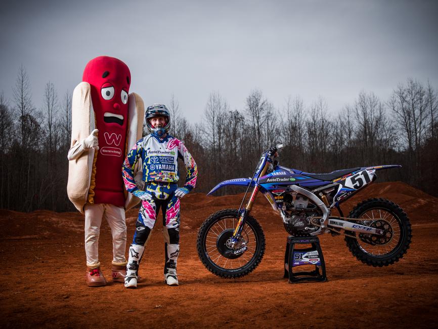 Okay, we all love this sport, and we all think that every company should get behind it, but some sponsorship deals are even surprising to fans like us. When Wienerschnitzel, the world’s largest hot dog chain, jumped on board with the Autotrader.com/Toyota/JGR Yamaha team this year, the fit seemed a little odd. Why did they pick motocross? But then we saw Phil Nicoletti do laps of the supercross test track while wearing a hot dog suit, and then we got free hot dogs in the JRG pit at the races…we were starting to believe!