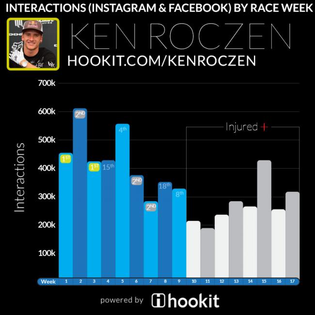 Ken Roczen missed eight rounds of Monster Energy Supercross this year with an ankle injury. Eight rounds he was not racing live on Fox Sports every weekend. Eight rounds where the media spotlight wasn’t focused on him. Ken did do some TV spots on Fox Sports, but in general, the spotlight had moved to Dungey. How important were those missed races to his social profile? More important than one might think. According to Hookit, Roczen’s interactions on Instagram and Facebook declined during the rounds he was injured. Check out the chart below.