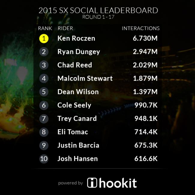 Through the Monster Energy Supercross season (January-May) Roczen had 6.730 million interactions (likes, comments) across Facebook and Instagram. To put in perspective: Ryan Dungey, who won the 450SX Championship, was second with 2.947 million. Like we said, Roczen is huge on social media.