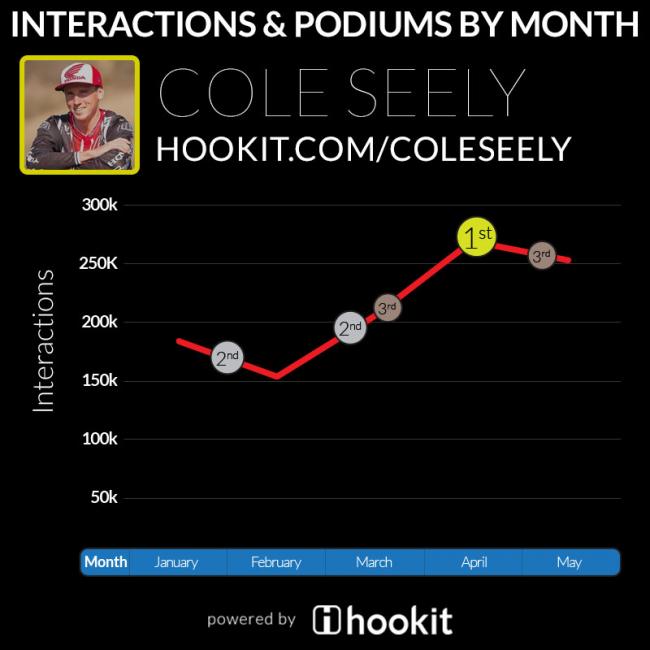“Win on Sunday, sell on Monday” has always been the old adage in motorsports. While it doesn’t hold as much clout as it used to, nothing cures something as quick as winning. In his first 450SX season with HRC Honda, Cole Seely blossomed into a consistent podium guy—and even a winner. How much did it help his social profile? Take a look at his interactions by podium performances—his interactions were at their highest when he won.