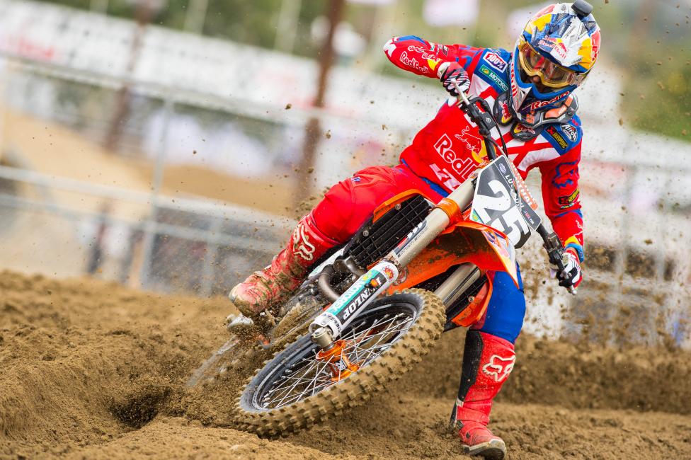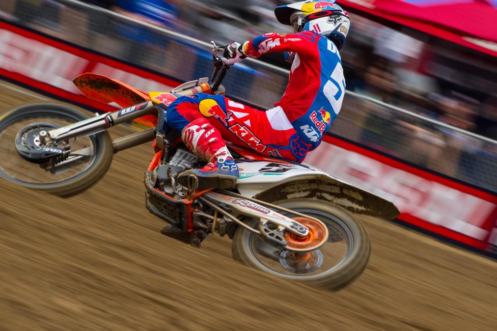 Another of Marvin, this time he’s leaving a rut earlier than those before him did. The rut may have an upcoming hole he may be trying to avoid, or he may be attempting to set himself up for the next turn. His foot is planted, allowing him to drag the front wheel out of that rut and give him leverage to lift with. This is not usually a recommended move, as he’s upsetting his momentum through the turn, but when a rider of Musquin’s caliber makes a deliberate move such as this, there’s always a reason.