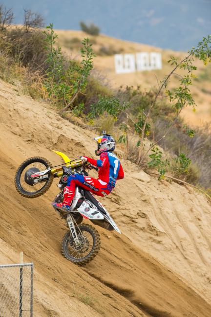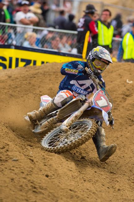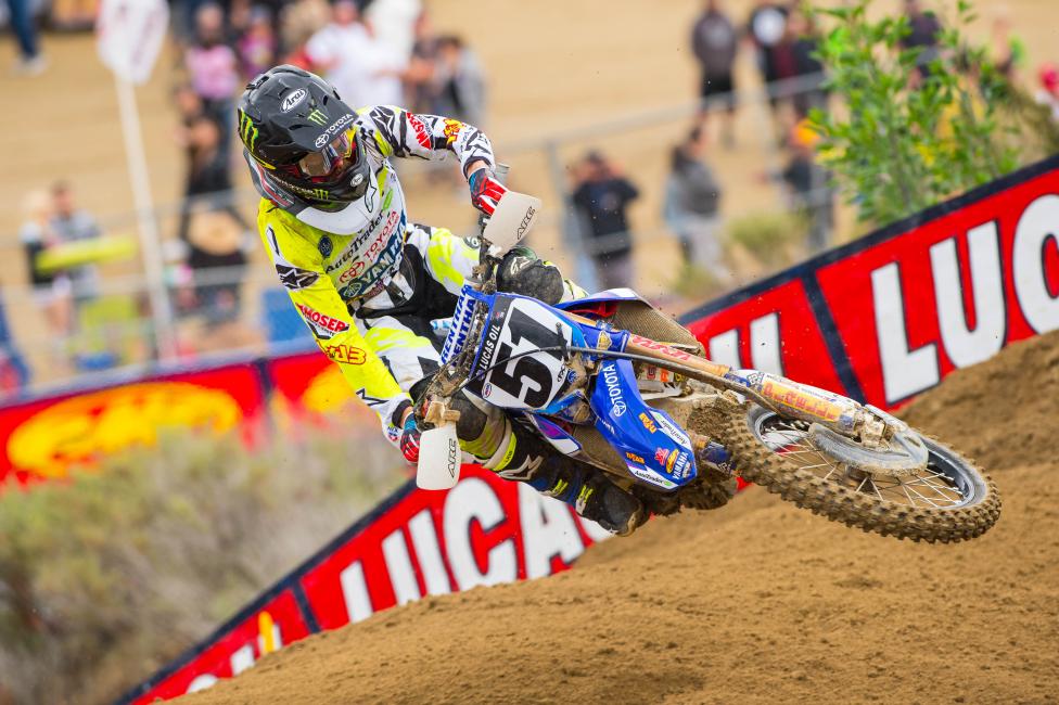 Justin Barcia is shown here in a typical turn-down maneuver to keep his AutoTrader.com/Toyota/JGR Yamaha low to the ground. Glen Helen is notorious for small jumps before climbing higher in a section. The key is to keep the bike on the ground and maximize acceleration. The higher the bike jumps, the more it will compress upon landing. The more it compresses, the more it will rebound back up afterwards. All of those are bad. Ideally, Barcia will barely leave the ground, and his rear tire will maintain contact and never stop digging up that next hill. To accomplish that, he’s turning the handlebars as the bike crests the rise, and instead of that momentum carrying him upward, he scrubs the speed off and stays lower. This move is used so often that it seems commonplace, but it really is a highly technical move. Instructing a novice rider to find the nearest jump, turn his handlebars to one side, lean off the bike as hard as you can, and hope for the best will usually end up in an ambulance ride. Justin is making it look easy here.