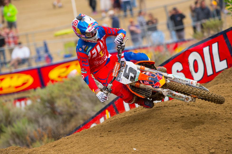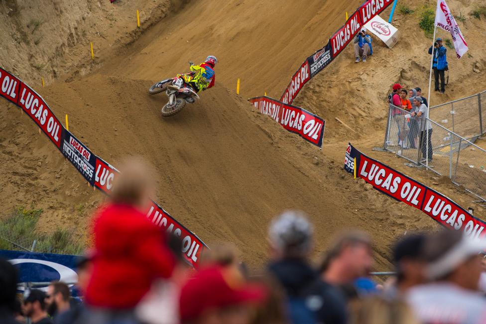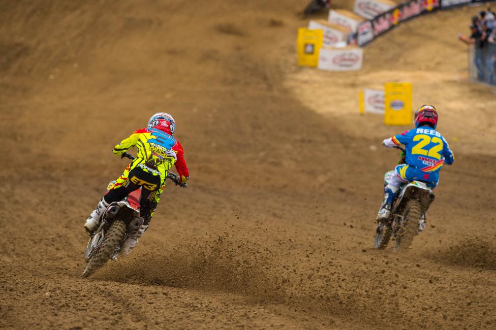 There was a time when Eli Tomac would have been star-struck in this spot. Those days are long gone. It is impressive to watch Eli come up on riders. His only thought is how to get around them in the quickest time possible. He has a clear speed advantage on the field right now, and his confidence is growing with every moto. In this particular shot, Tomac is using the outside line on the start straight, which was longer but the dirt was more compact. Reed is more in the middle, which allowed him to protect the inside but was also deeper loam. Even if I didn’t know that to be true, this picture hints at it. Tomac is able to carry a wheelie in the harder dirt while Reed’s bike is laboring in the soft stuff. Tomac is also standing to get leverage on the bike, driving his weight through the pegs. He’ll stand earlier and stay standing later than a lot of the other riders, a big advantage on rough outdoor tracks.
