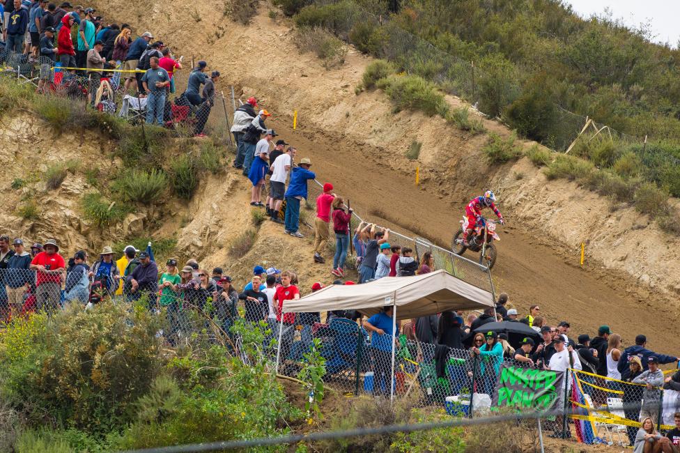 Race winner Marvin Musquin is hard on the brakes here. This is the long down-hill in the middle of the track that actually didn’t get that rough compared to most years. At the bottom there was a tight inside line and a long, fast sweeping outside line as well. This picture gives an idea of the actual angle of these up-hills and down-hills, as television does them no justice.