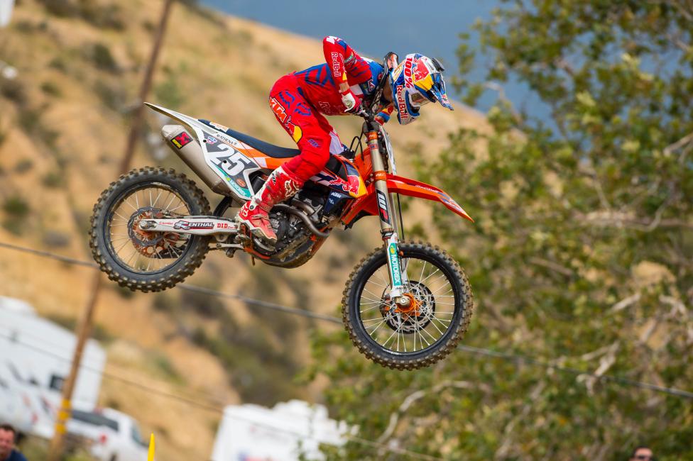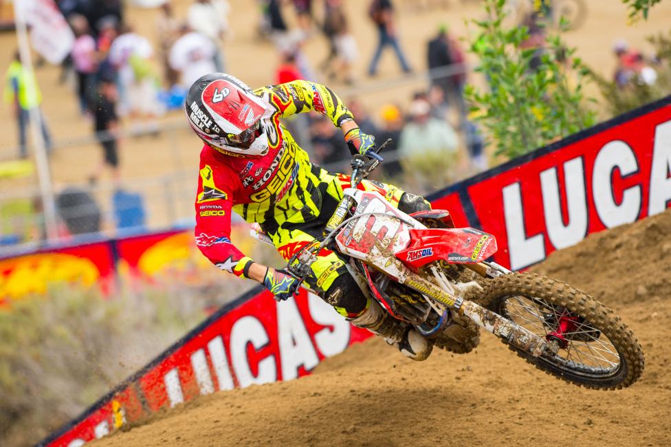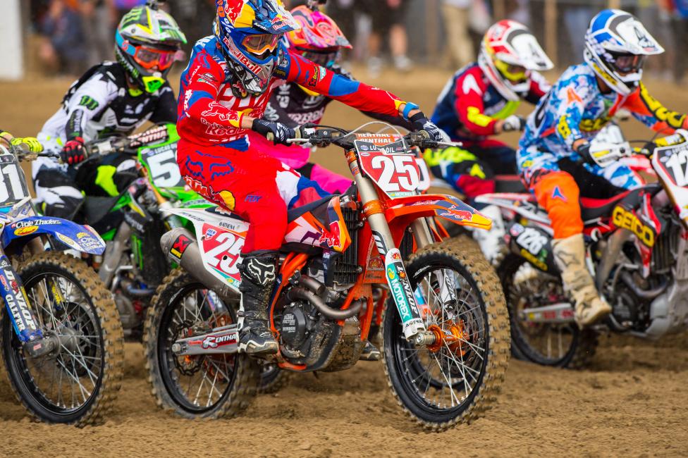 Here’s Marvelous Marv ripping a big holeshot in moto one. He’s leaning back to get every bit of traction on that rear tire and keep that 250 roaring. Interesting that his left foot is at the ready to grab the next gear, and his hand is nowhere near the clutch, which is standard operating procedure for a good start. Just behind Musquin, Adam Cianciarulo is seconds from disaster.