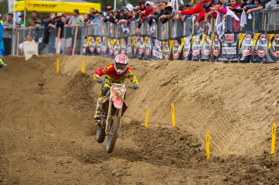 Das champ, Ken Roczen, is pictured mid-ascent up Mt. St. Helens. As you can see, it’s challenging to climb the biggest hill of the series. There are two jumps en route, which only complicates things further. Momentum is the key, and as you can see from Roczen’s roost, he is full noise and looking for more. He’s doing his best to stay forward on the bike even though gravity and the force of sixty horsepower are pulling him off the back.