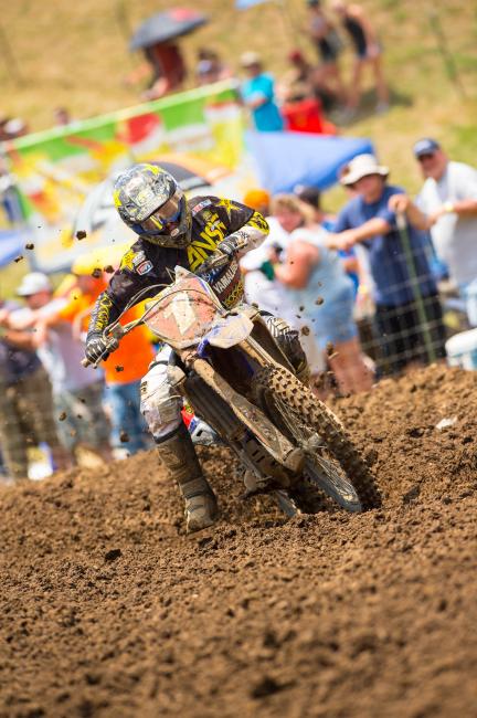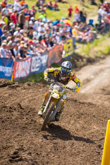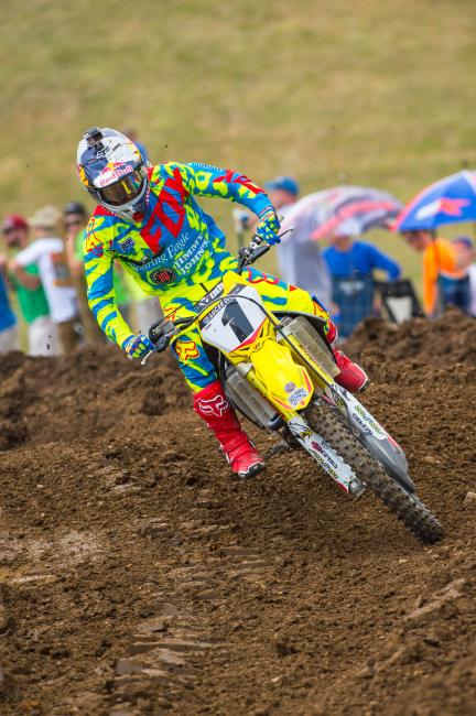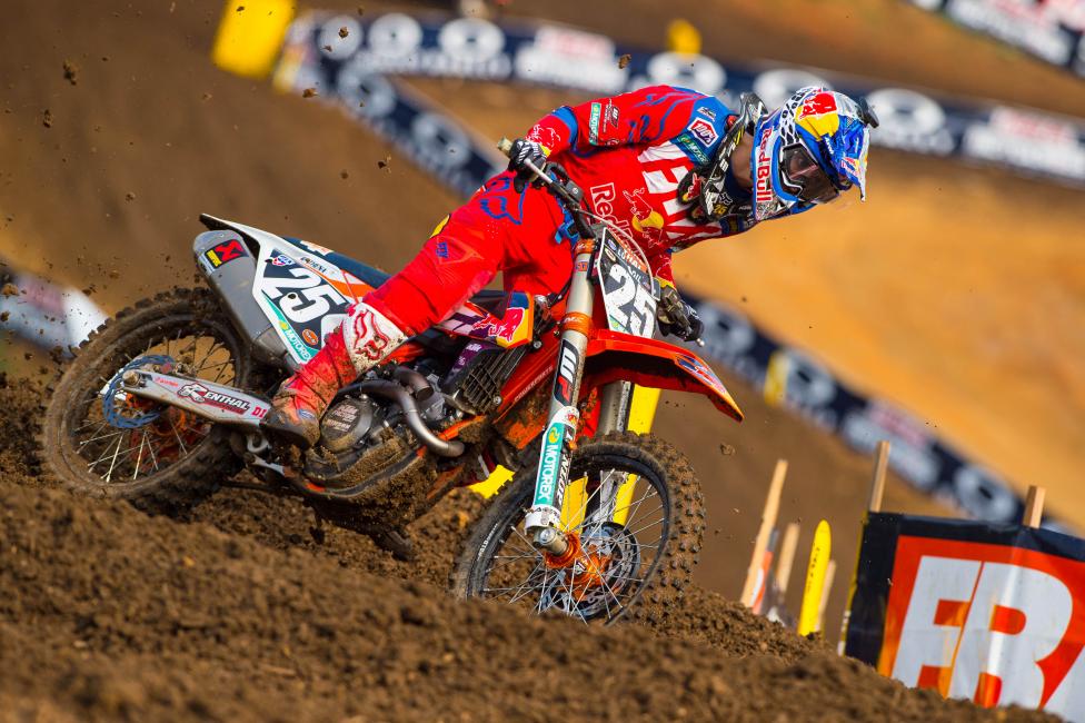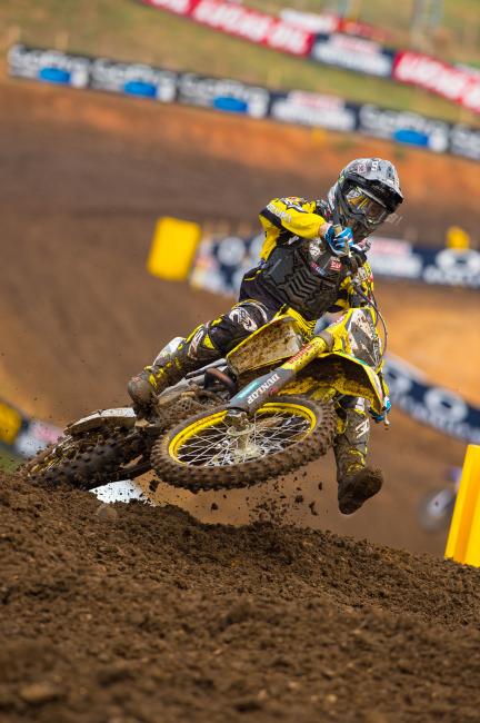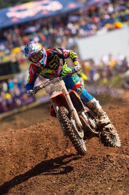 Marvin Musquin is one of the most technical riders today. He hops, skips, and, most importantly, avoids many of the bumps on a racetrack. Here he is leaning extremely far forward while accelerating down a hill in timed qualifying. The track was a bit muddy still, and he was surely worried about losing front-tire grip.