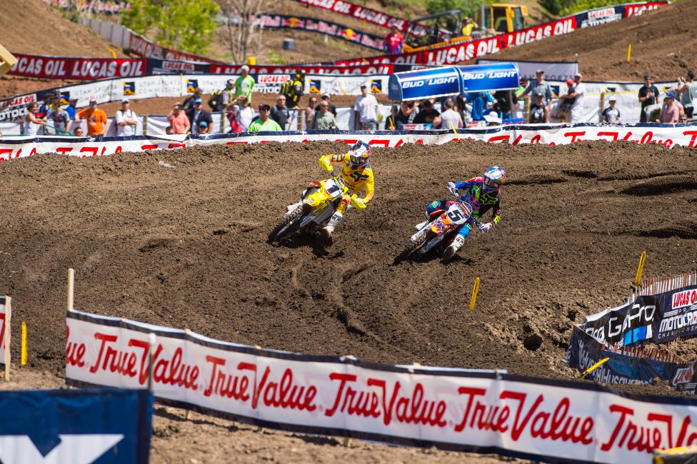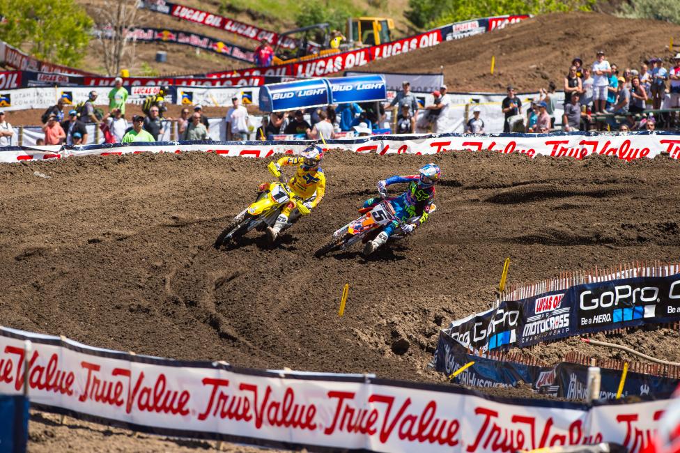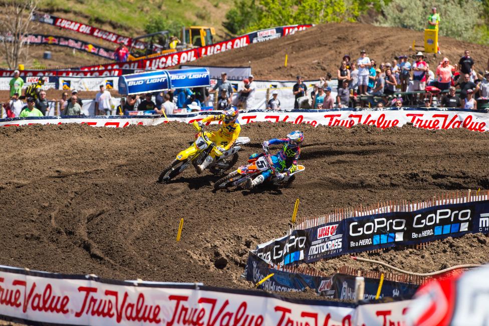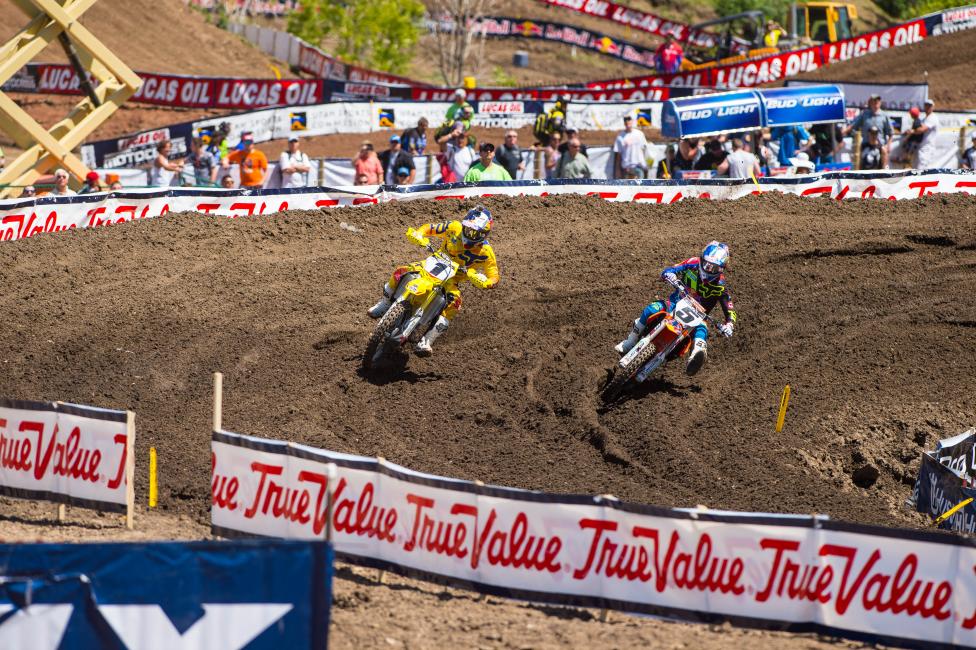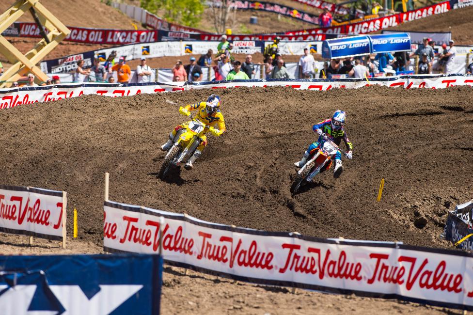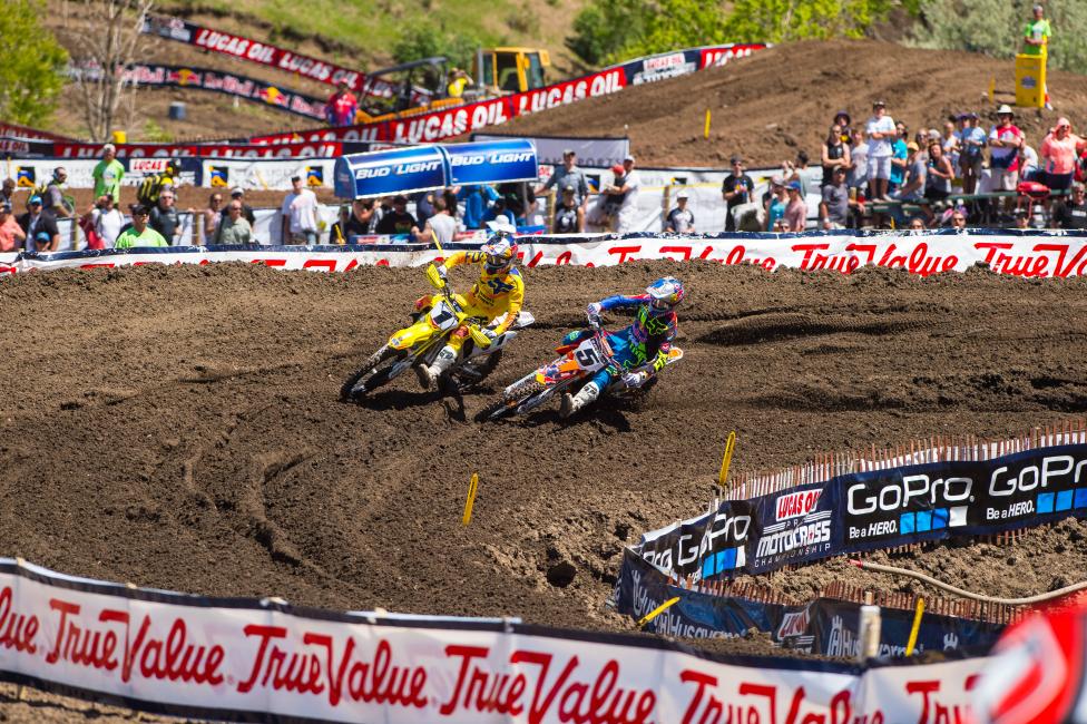 Ryan Dungey chases Ken Roczen around Thunder Valley here. This is the same downhill that claimed James Stewart in 2012 and ended Eli Tomac’s 2015 season. It’s interesting to see Roczen aiming toward the outside while Ryan Dungey is headed to the extreme inside. Roczen is opting for the smoother line, but he also must cover more distance. Dungey is taking the shortest line but also the roughest. Most importantly, Dungey is not following Roczen. It’s impossible to make a pass when following, and Dungey knows this all too well. For any youngsters reading this, watch your favorite riders closely when they are behind a competitor. Even if the line they choose isn’t ideal, if it allows them to get out from directly behind the rider in front, they will opt for it. Ricky Carmichael was the absolute master of this on outdoor tracks.