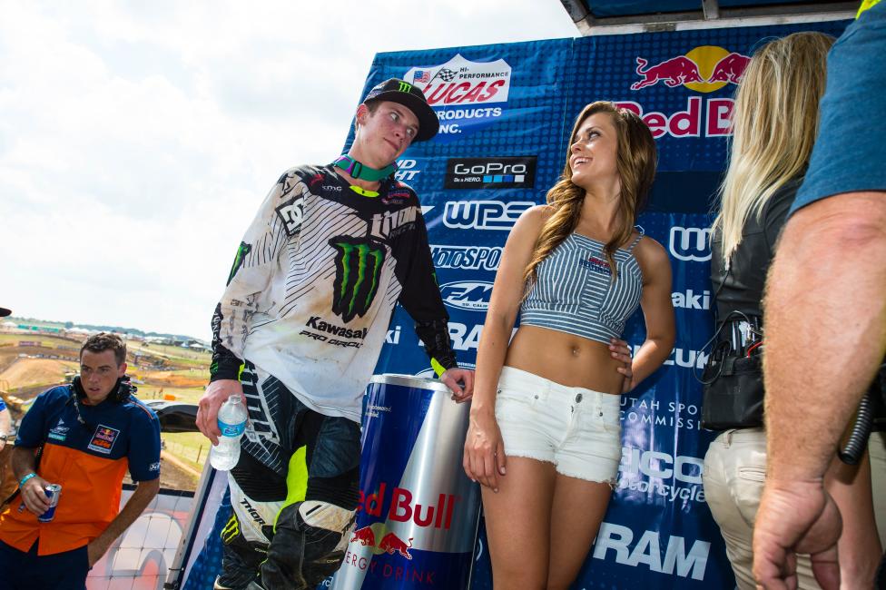 Here we see a young Adam Cianciarulo swinging for the fences. His effort to keep eye contact is on a herculean scale. His untucked jersey and bottle of Nestle’s finest H2O says he is hot, sweaty, and thirsty, but that he's also come to party. Flirtatious post-race podium performances are nothing new to this sport, as legends like Jeff Stanton used to kiss trophy girls, and Jim Holley, well, we will just leave Jim Holley out of this. For the newer generation, however, blatant courting is an awkward spectacle; the KTM-affiliated gentleman to the left can do nothing but stare at the ground and hope for the moment to pass.