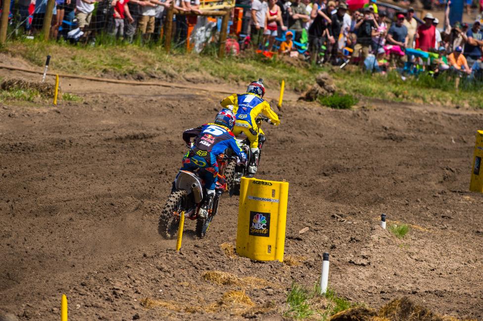 Here’s Dungey making a move on Roczen. Dungey forced the issue up the inside at the bottom of this downhill, and Roczen had no choice but to concede, at least for the moment. If Roczen tried to fight Dungey off from this position, he would end up on the ground. Dungey is locked into his rut and leaned over, while Kenny is unsettled and still trying to pivot.