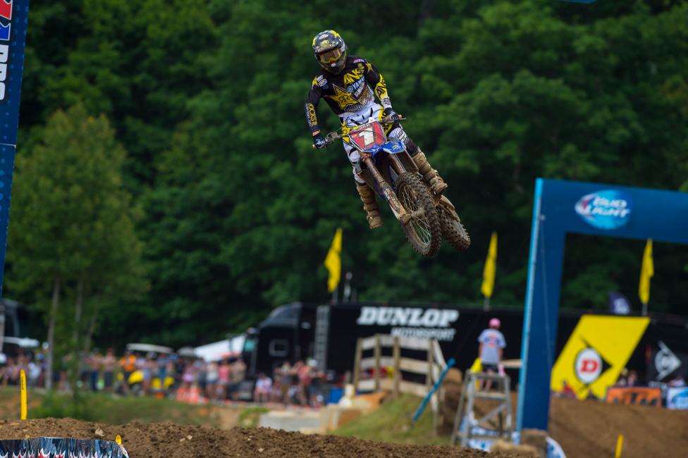 Zach Osborne is exploding through a rut on a jump face in this photo. This happens when the rut becomes too deep and the bike compresses into the outer edges of the rut. This can also happen when hitting the jump too fast, and the same result occurs—the bike compresses into the rut too deeply. The bike most likely suffered what is known as a “G-out,” where the suspension compresses fully and then rebounds a bit unpredictably. His jump angle is a bit off-kilter, as the rut gave way under his machine’s pressure. In fact, you can see most of the rut’s remnants soaring alongside Osborne in the Tennessee skyline.