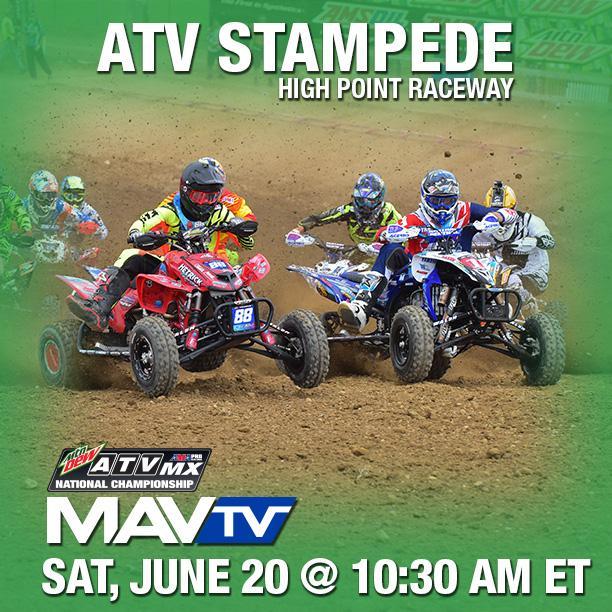 Don't miss the ATVMX feature show on MAVTV this Saturday, June 20 at 10:30 a.m. ET from the ATV Stampede at High Point Raceway, round four of the Mtn. Dew ATV Motocross National Championship, sanctioned by AMA Pro Racing (ATVMX).
