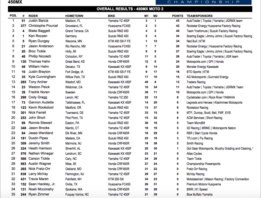 Barcia was in control the entire race, cruising to the moto win and his first career 450MX overall. Blake Baggett and Christophe Pourcel swapped second numerous times before Baggett made the final pass late in the race.