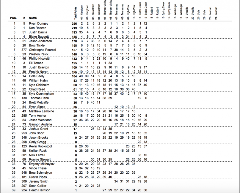 Coming out of the off weekend, Ryan Dungey enters Round 6 (of 12) with a thirty-seven-point lead over Ken Roczen. Dungey has built his lead with consistency, finishing outside the top two only once this season, a sixth in the first moto at Glen Helen. He also has three moto wins on the season.
