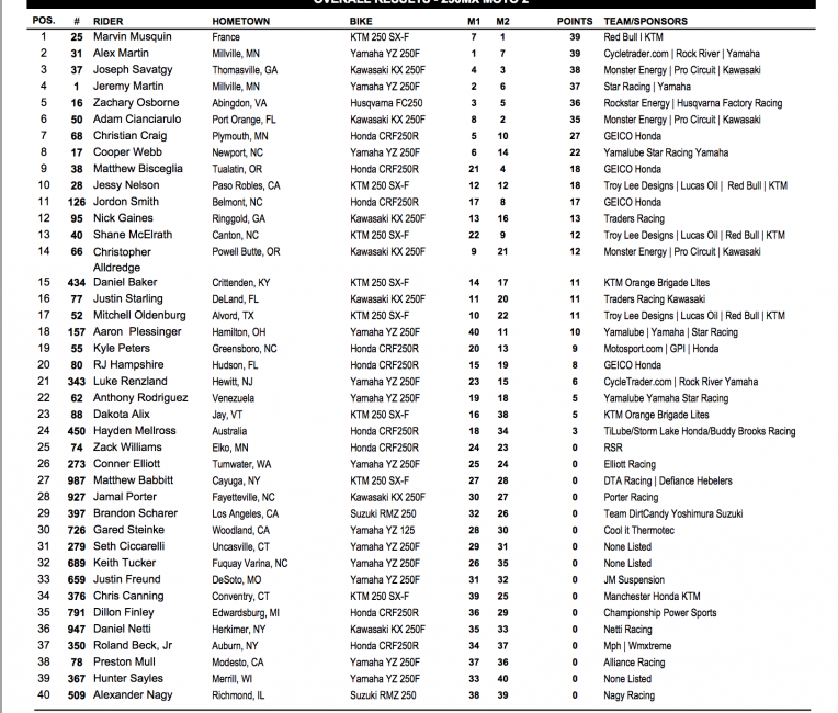Joey Savatgy and Christian Craig would round out the top five. Series points leader Marvin Musquin tangled with Adam Cianciarulo early in the race and could only work back to seventh. Cianciarulo finished eighth. In his first race back since Hangtown, Cooper Webb finished sixth.