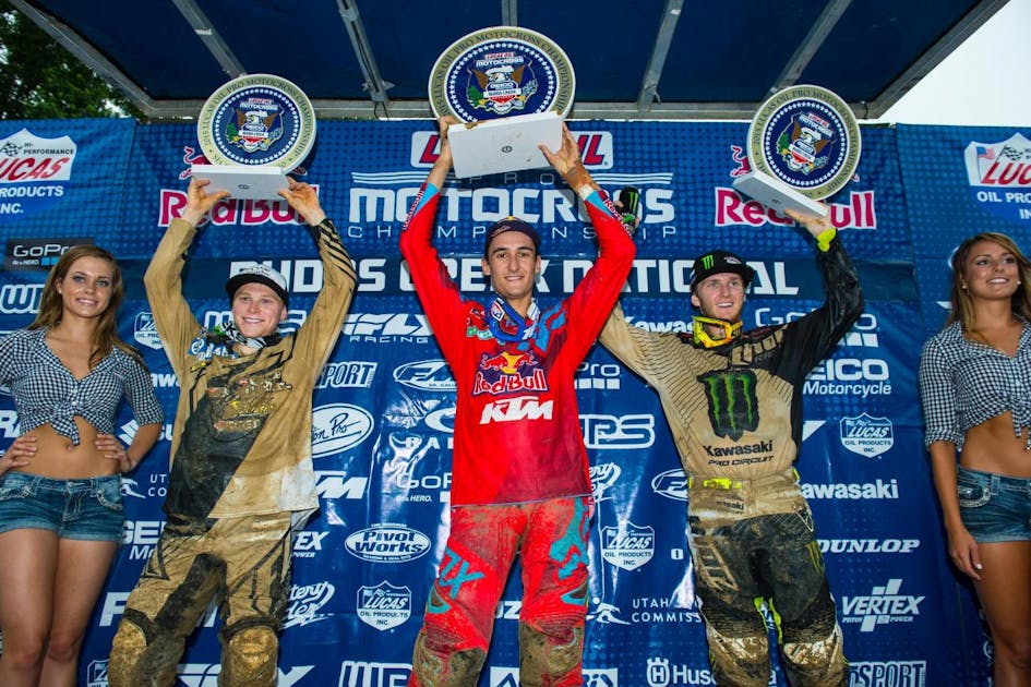 Joey Savatgy had a breakout ride last year at the Indiana National in heavy rain, so it was only fitting he bring up the rear on the podium. “I don’t really do anything different, I think you can get away with a lot more when it’s not muddy. When it’s muddy, and you start riding out of you’re comfort zone and on the edges, you get off into the mud and that’s when mistakes happen,” he said following the race. The second moto podium was Savatgy’s third of the season.