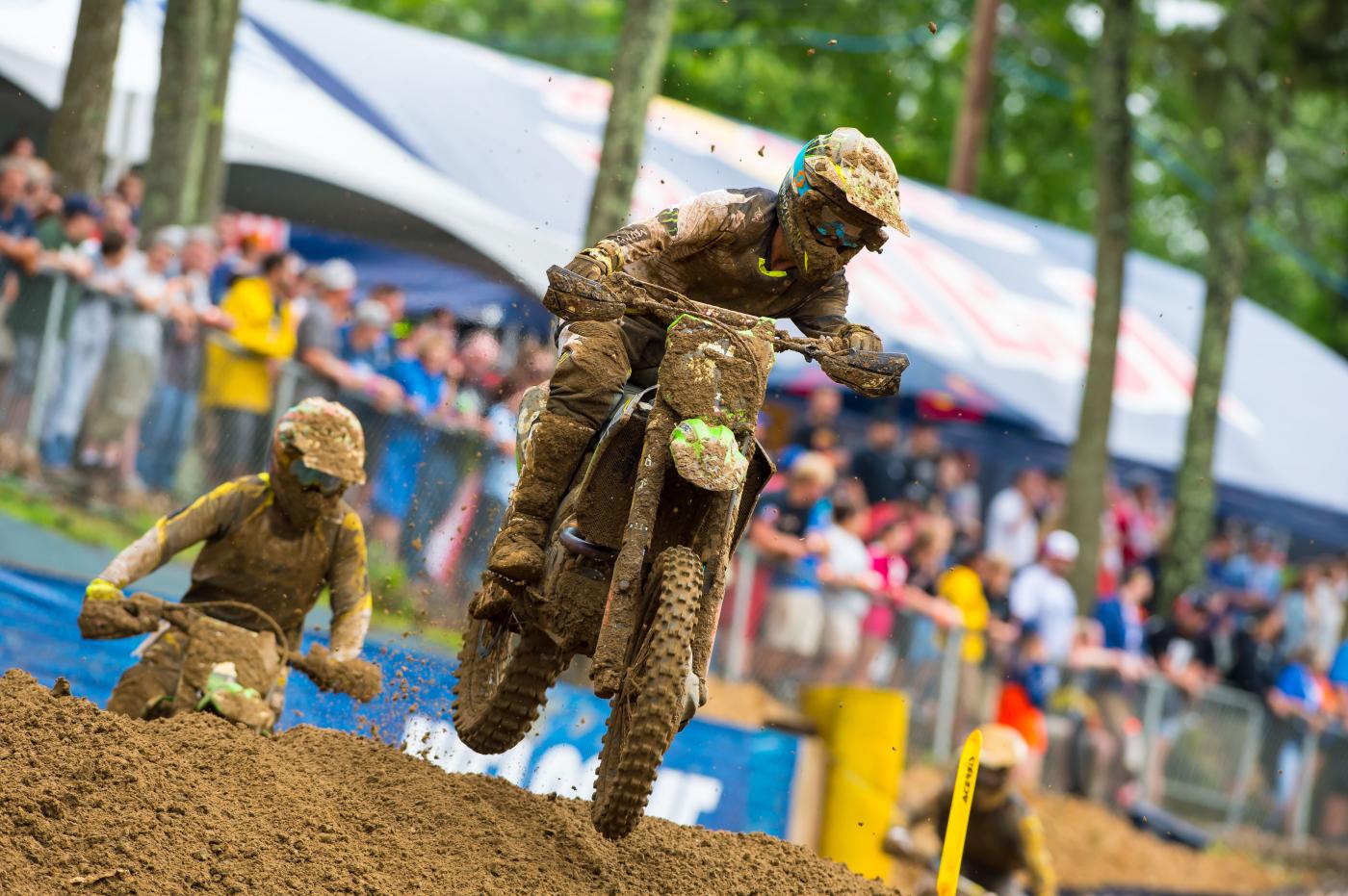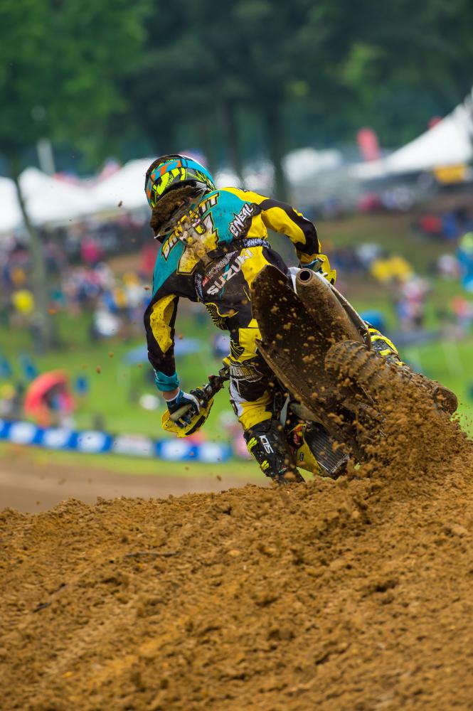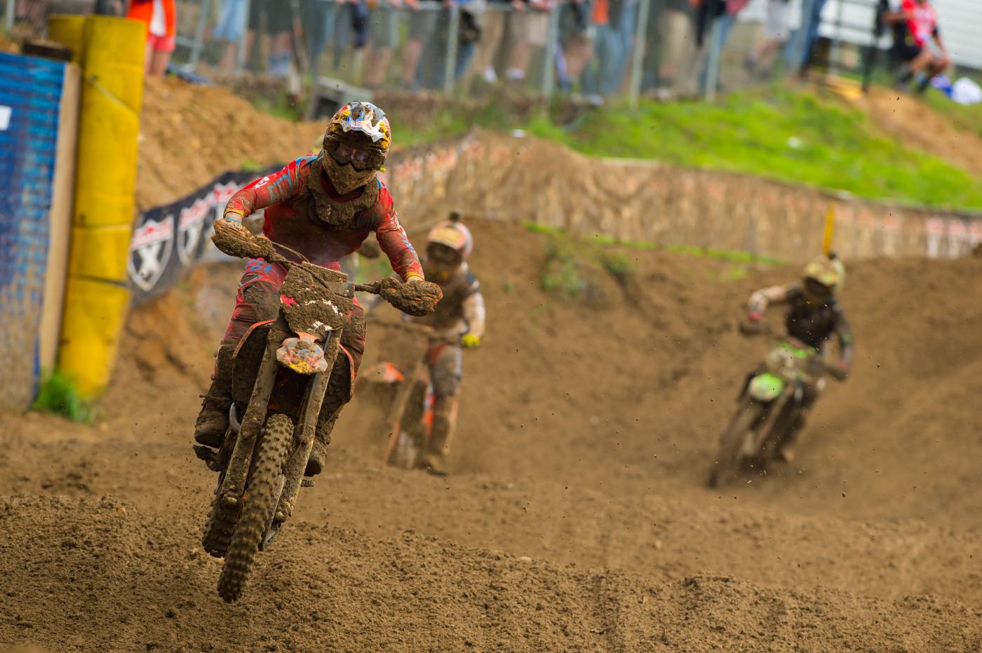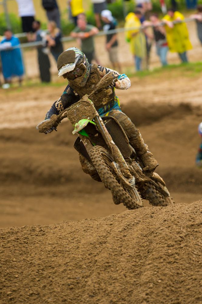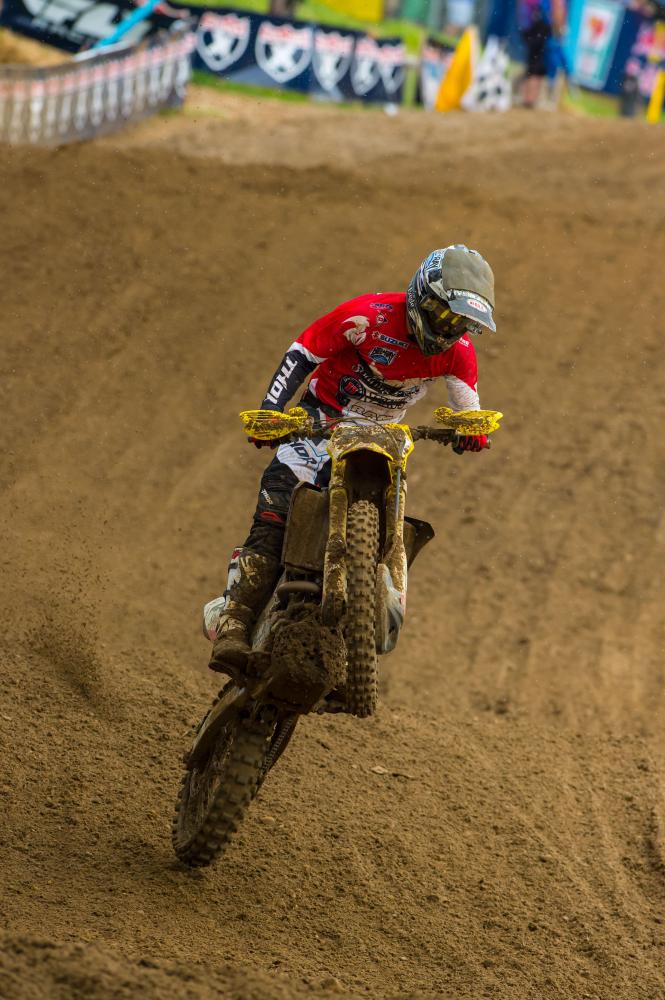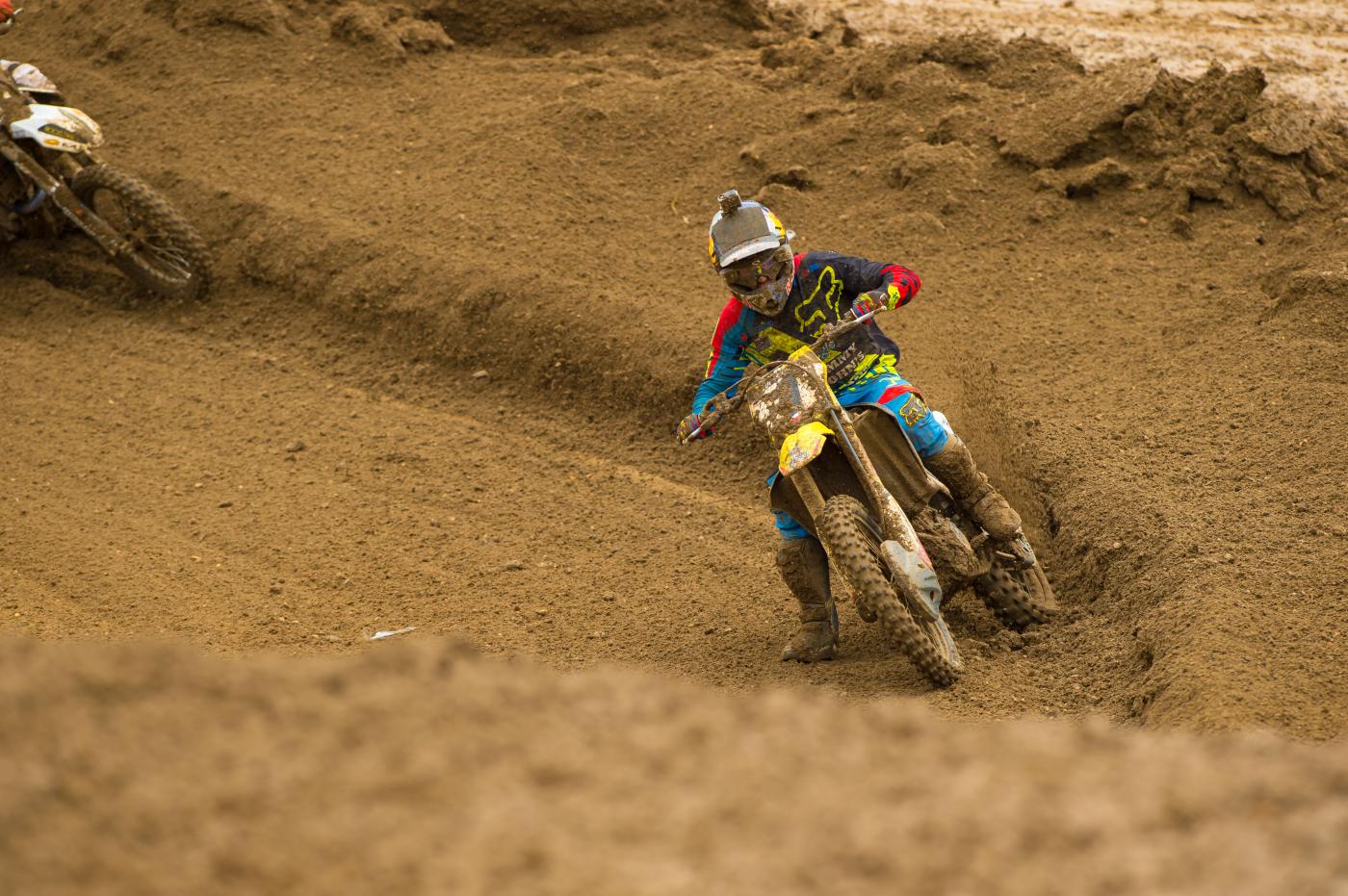 No, not really anything different. It’s just I think you can get away with a lot more when it’s not muddy. When it’s muddy you start riding a little out of your comfort zone or on the edge. You start making mistakes and you get off into the mud. That’s when mistakes happen. It’s just the proper technique weight on the outside of the foot pegs and staying on the balls of your feet, not letting your feet get ripped off. Obviously, when it’s muddy the ruts get deep and it just starts to get slippery. Nothing crazy, no secrets; just knowing how to ride and being taught the proper way to ride. It’s a little different when it’s wet. It’s a little bit slowed down in technique, but when it’s fast and dry, that’s when I need to learn to be up here as well.