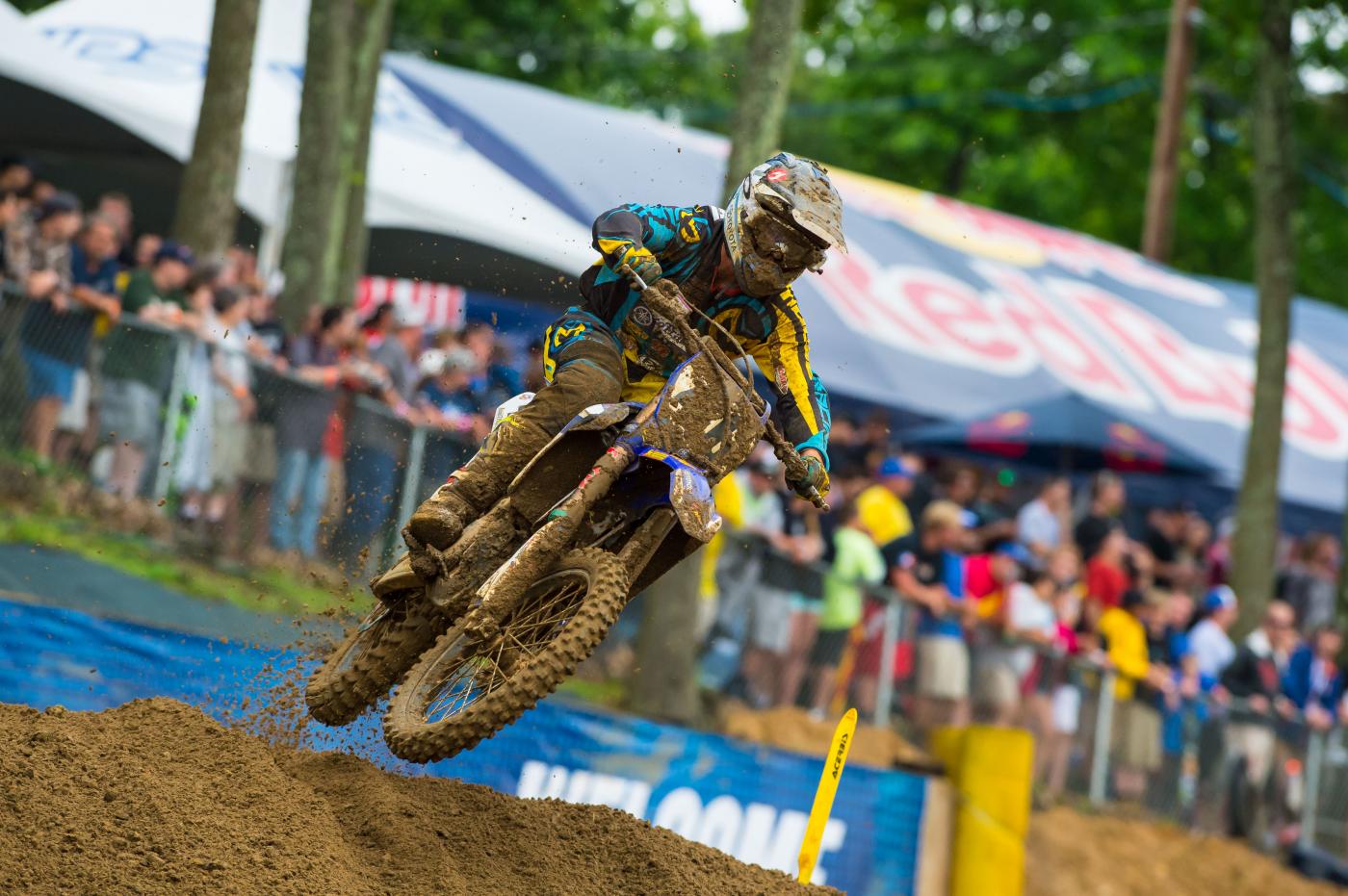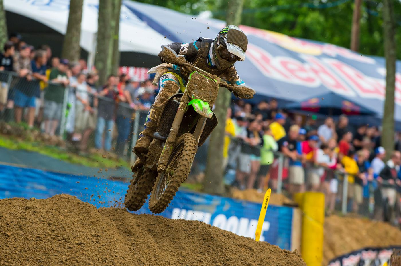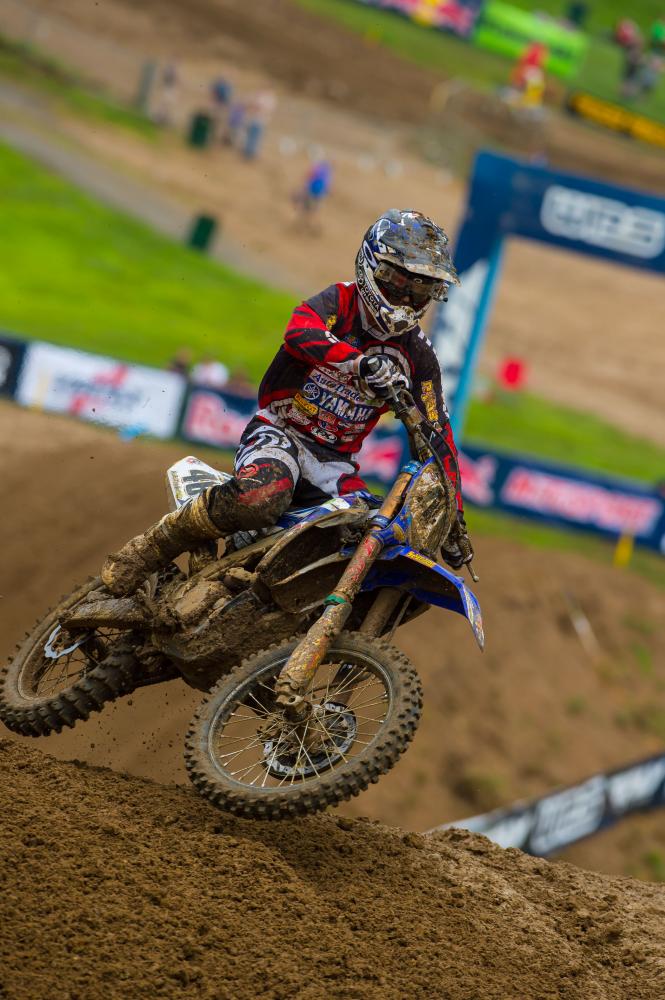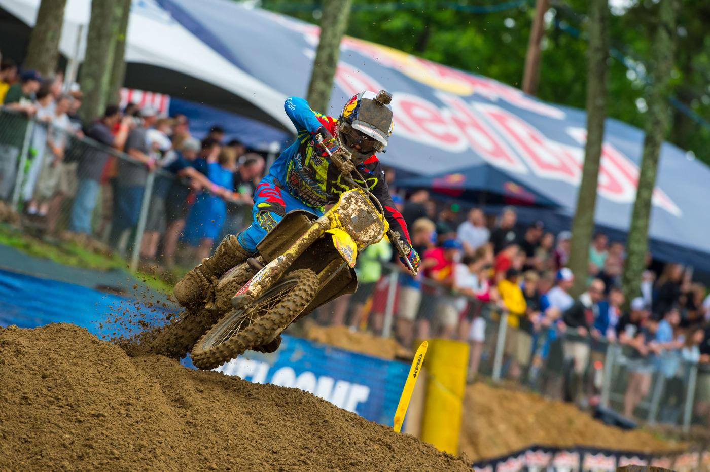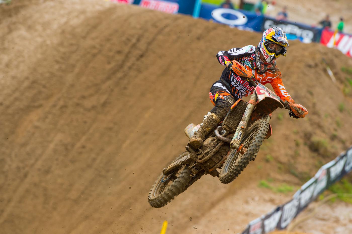 No, not really anything different. It’s just I think you can get away with a lot more when it’s not muddy. When it’s muddy you start riding a little out of your comfort zone or on the edge. You start making mistakes and you get off into the mud. That’s when mistakes happen. It’s just the proper technique weight on the outside of the foot pegs and staying on the balls of your feet, not letting your feet get ripped off. Obviously, when it’s muddy the ruts get deep and it just starts to get slippery. Nothing crazy, no secrets; just knowing how to ride and being taught the proper way to ride. It’s a little different when it’s wet. It’s a little bit slowed down in technique, but when it’s fast and dry, that’s when I need to learn to be up here as well.