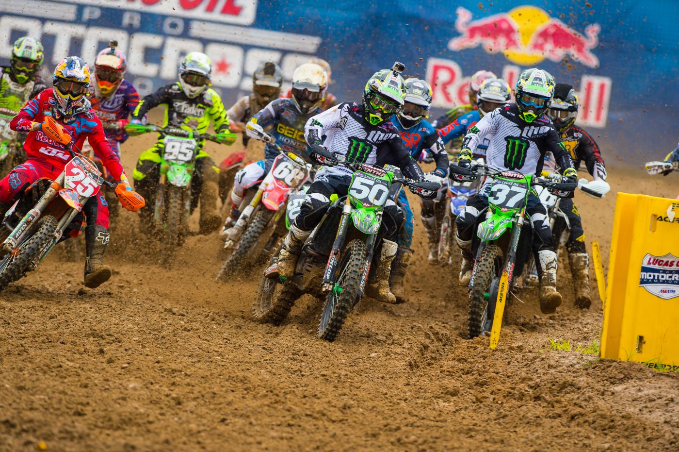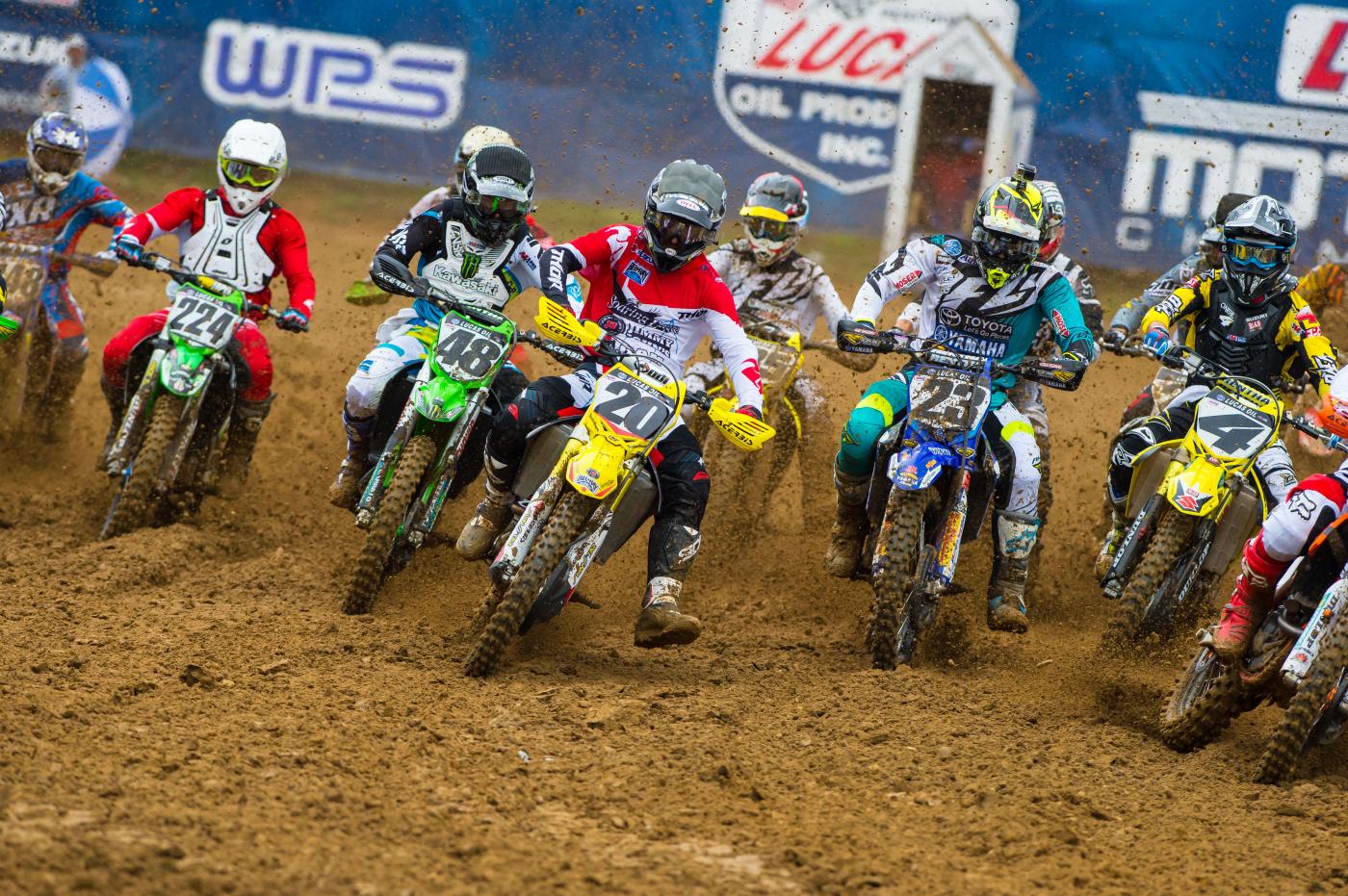 Honestly, it was just you were getting sprayed with mud. It was just slop. I didn’t have the greatest start. [Ryan] Dungey went down over that step-up and just caused chaos. There were people everywhere. I was able to wiggle my way through to the rollers before the finish line and put myself in good position. Then latched onto Baggett and Roczen. Pulled with them for about fifteen minutes, and then I made a really big bobble and I had like plus-sixteen on Anderson because he was right behind me for a while. I was just like, screw this, I’m just going to ride her in. Last four laps, my bike started sounding pretty hollow. I was hard on the clutch and stuff. The mechanics and Johnny Ohler gave me a few “slow it down” signs, so I got the hint that something wasn’t right, so I just rode it in. –Matthes