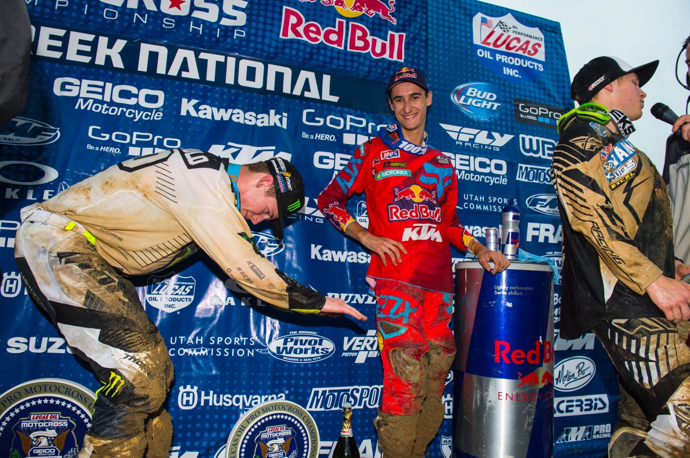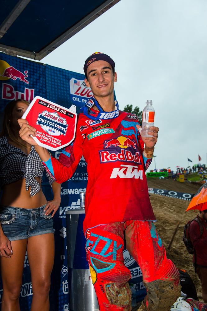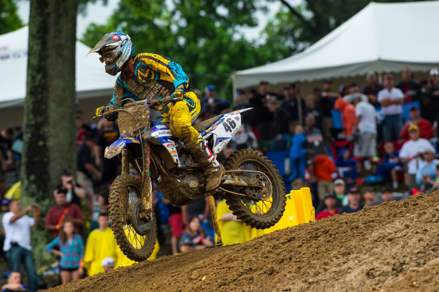 I love coming here. I had one of my worst crashes and was out for six weeks back in 2010, but since then I’ve won it a few times. I won it in 2012, ’13, and ’14. So this place is awesome, rain or shine. It kind of revived me coming back here. Of course, it’s not ideal when you’re from Southern California and it’s pouring down rain. The only time we see that is when we left the sprinklers on too long. But other than that this place is awesome. On the day definitely would have liked to be in the top three the first moto, but they were right there. I was in the roost of those guys. Just got to the back of some of the lappers. I didn’t make the smartest decisions, and stuff just happens out there, it’s motocross. So definitely wanted to come out the second moto and be on the box.