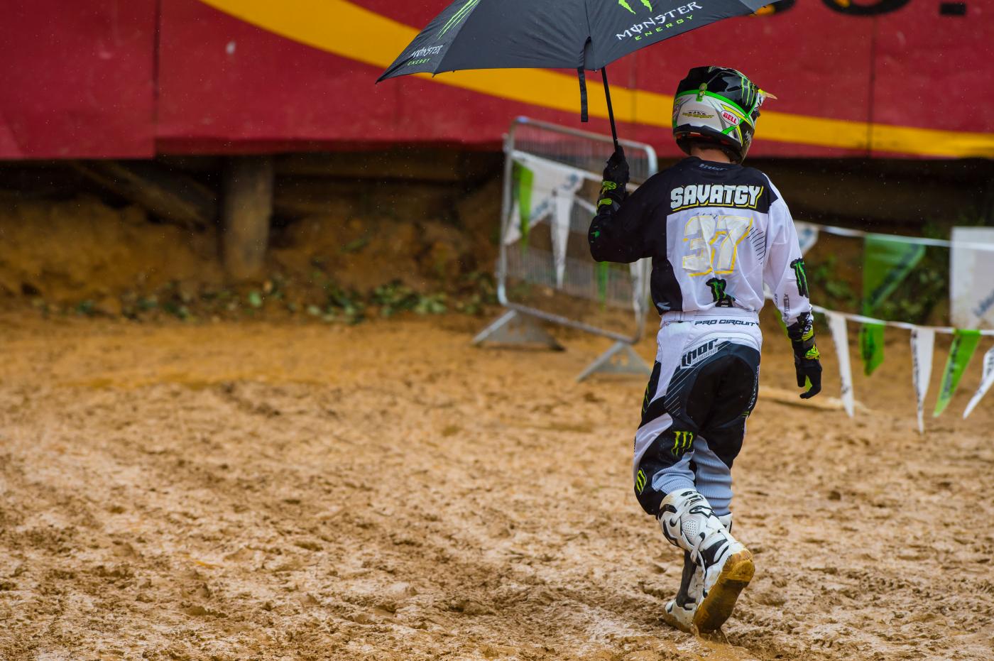 Adam Cianciarulo: I was actually saying to Wil just a couple minutes ago that, coming into the day when they said it’s 100 percent chance of rain, I wanted it to be so wet. I wanted it to be like ’09. I wanted to race in one of those races where you come in and get goggles and gloves and you’re still in it, one of those. But it wasn’t that. It was like the mud where you still have to hit the jumps and it’s just really sketchy. You’ve got to wear roll-offs and all that stuff. They’ll probably call this race. I don’t see them if not it’s going to be bad. But it sucks for Jason Anderson because he got seventh in the first moto [the rain stopped and they ran the 450s after all].