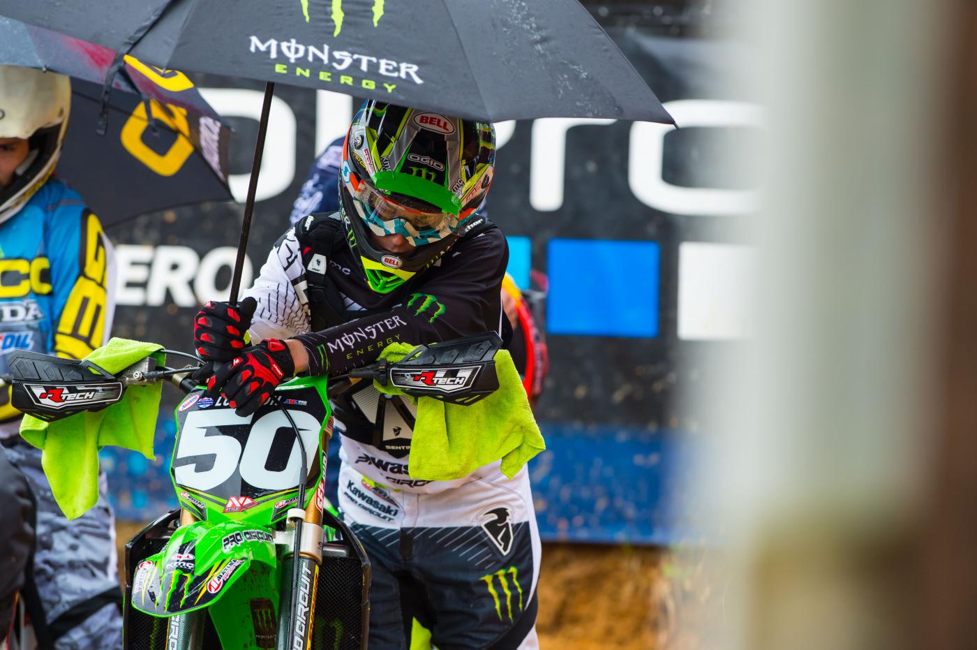 Racer X: Right now we’re underneath the Kawi truck, tornado warnings are going, it’s pouring rain. I think they might call this 450 moto.