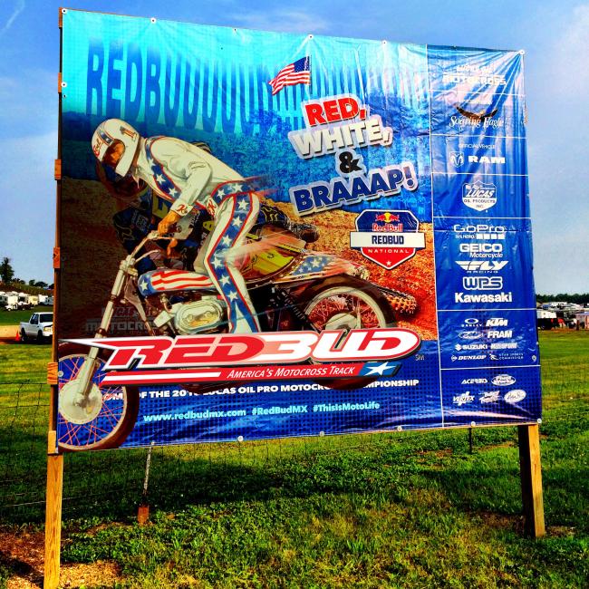 Let me use this space as a soapbox for one paragraph: Some followers were genuinely incensed that RedBud, which is all-American as baseball, hot dogs, apple pie, and Dodge Ram trucks (unnecessary sponsor mention), would use a foreign-born rider—especially one from Germany—on their billboard. Seriously. Like, totally pissed. Forget the fact that America is the land of opportunity, that many of our forefathers were not only German immigrants but British, Irish, French, etc., and that whole “melting pot” mentality that made this country great, not only as a society but as a motocross destination. Instead, let’s beat on the people who throw this big motocross party every summer for having the audacity to not only run an image of the #1 defending series champ, but also the actual RedBud winner from 2014… Maybe it speaks to the quick, immediate gratification of posting something negative that none of the comments we had to erase mentioned the fact that “ze German” is on a Japanese motorcycle--and it was "ze British" we claimed our Independence from anyway, but I digress. Where’s Jeff Gibson on that Cannondale when you need him? Or “Rocket” Rex Staten aboard that Harley-Davidson MX bike? And what about Evel Kniev… Hey, there’s an idea!