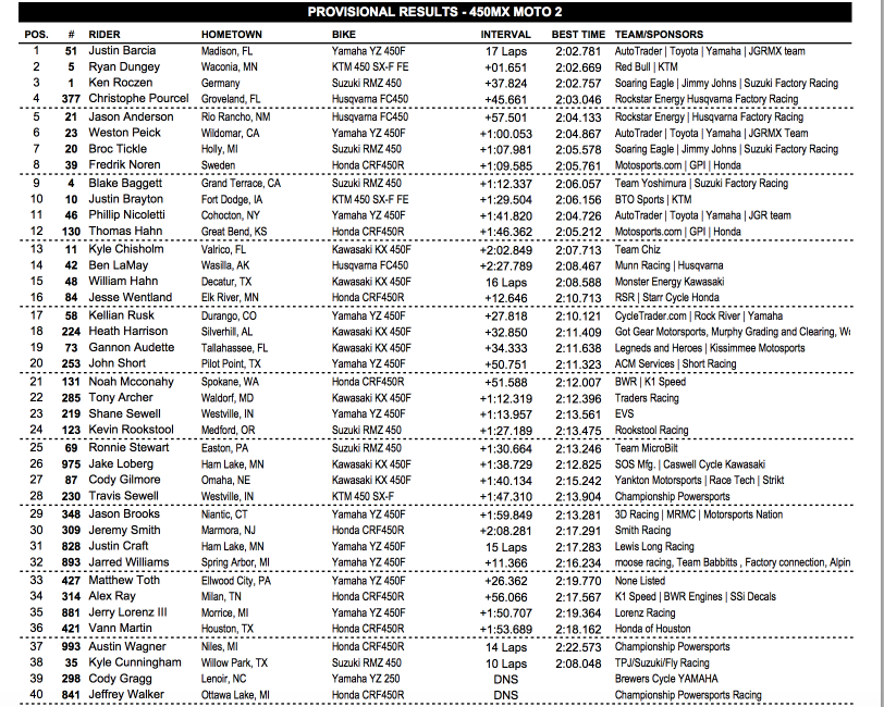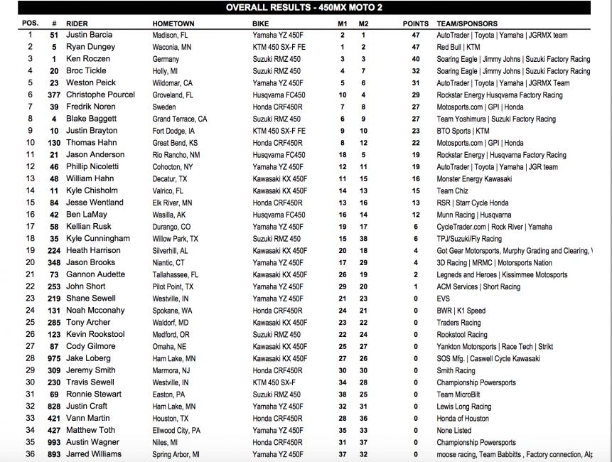 A cat and mouse game broke out between the two as Barcia would stretch his lead to just over 2 seconds, only to have Dungey pull it back to under one. The game played out the entire moto until the final lap when Dungey made a final push, drawing to the rear of Barcia. Dungey cut the lead to less than 2 seconds on the final lap, but Barcia was rock solid over the final lap and pull off the win by 1.6 seconds. Dungey would take second in front of Roczen, Pourcel and Jason Anderson.