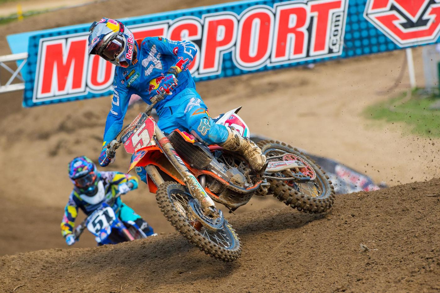 Red Bull KTM’s Marvin Musquin will probably be sitting there wondering what could be after the race. Musquin jetted into the lead in the first moto and was riding great, pulling away from the field. Then a crash set him back to tenth, he worked his way to fifth, crashed again back to tenth and put his head down to salvage eighth. The second moto he took a calmer third but lost more points to Martin as the gap is now nineteen. The good news for the Frenchman is that this weekend is Washougal, one of his best ones.