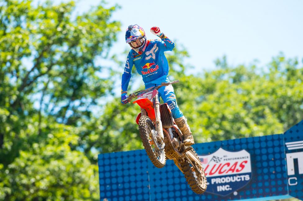 Ryan Dungey: I guess just starting the day out right from practice. The first practice wasn’t so good—it was a little muddy. But then the second practice, the track came around. Going into last night, we got woken up at 2:00 a.m. because the storms were just hitting hard and it was raining. I was like, I know it’s going to be muddy, but if we don’t get that afternoon shower, judging from the experience here that I’ve had, the track’s going to be awesome by the time we go out there racing, especially for second moto. And it was. We got off to a good start and got into the lead the first moto and just tried to be consistent. Put down good laps. It was really tricky because there was a lot of soft spots and hard spots, so the bike wanted to get sucked up a lot in the soft areas. And then the second moto I had a good start but then got shuffled there in the first turn. Kind of got back, made some passes, and then got up to [Justin] Barcia, and then was able to make the pass and just really tried to push it from there. Opened up a gap and then came in for the win. Overall it was good. I was looking for that 1-1. I had won that first moto, but I really wanted that 1-1 just because I hadn’t done that all year, and I really feel like it was time to get that done as well. Not greedily or anything like that, but that was my goal today regardless of being at the hometown race.