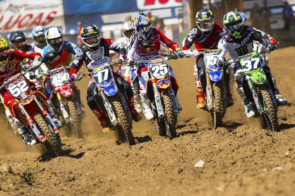 In the 450 Class, if you weren’t on a Yamaha, KTM, or Husky (which is a KTM), you were basically effed off the start. In the first moto, Barcia, Dungey, Andrew Short, Justin Brayton, Phil Nicoletti, and Weston Peick were up front. It was ridiculous. In the second moto, Barcia, Dungey, Peick, Pourcel, Nicoletti (from the outside), and Jason Anderson (from the inside) got out front. Seriously, go back and watch. There were two bikes that had a clear horsepower edge on the long start straight.