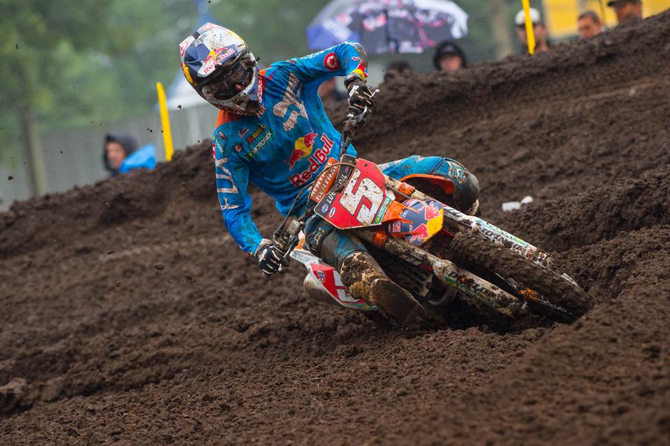 Ryan Dungey: The first practice, I kind of missed my little window there. Everybody kind of took off on that second lap. I was a little confused on whether this was the green flag, if the times were starting and then the rain started coming down. So we ended up fifteenth that practice, and it didn’t get much better track-wise, the track times in the second practice, so we were like thirteenth going to the gate. But we made a decent start—not the best start—in the first moto. I had to come through the pack. Came out fifth, I think I was. Made some passes pretty quick. [Christophe] Pourcel took a lot out of me to get around. He was riding good. There weren’t many lines. Even when I got outside, there were two good lines, inside and out. Once you ventured off those two, it wasn’t the greatest. By the time I got into second, [Justin] Barcia had a nice sized gap. Obviously, if you made a mistake that was going to be the only way I could kind of catch him. But I was trying to be smart and put the laps together.
