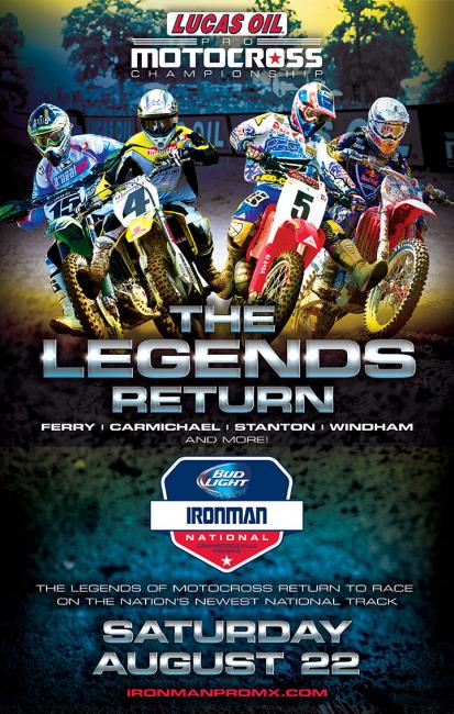 MORGANTOWN, W. Va. – With the season-ending Bud Light Ironman National looming, MX Sports Pro Racing announced today the introduction of a Legends Race for the twelfth and final round of the 2015 Lucas Oil Pro Motocross Championship, sanctioned by AMA Pro Racing. Headlined by former 450 Class champions Ricky Carmichael and Jeff Stanton, as well as beloved veterans Tim Ferry and Kevin Windham, the Legends Race is the first of its kind for the sport on such an impressive stage.