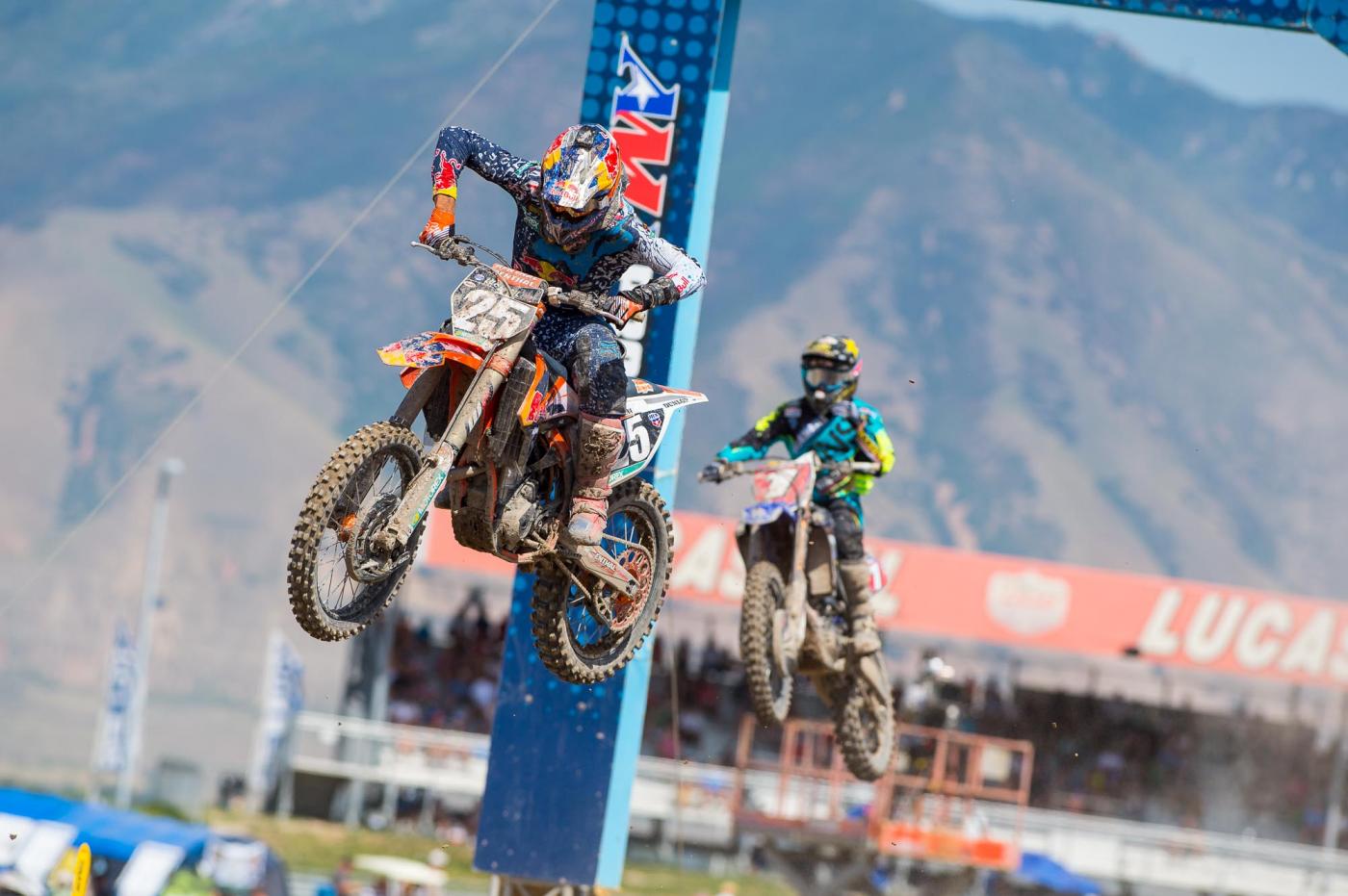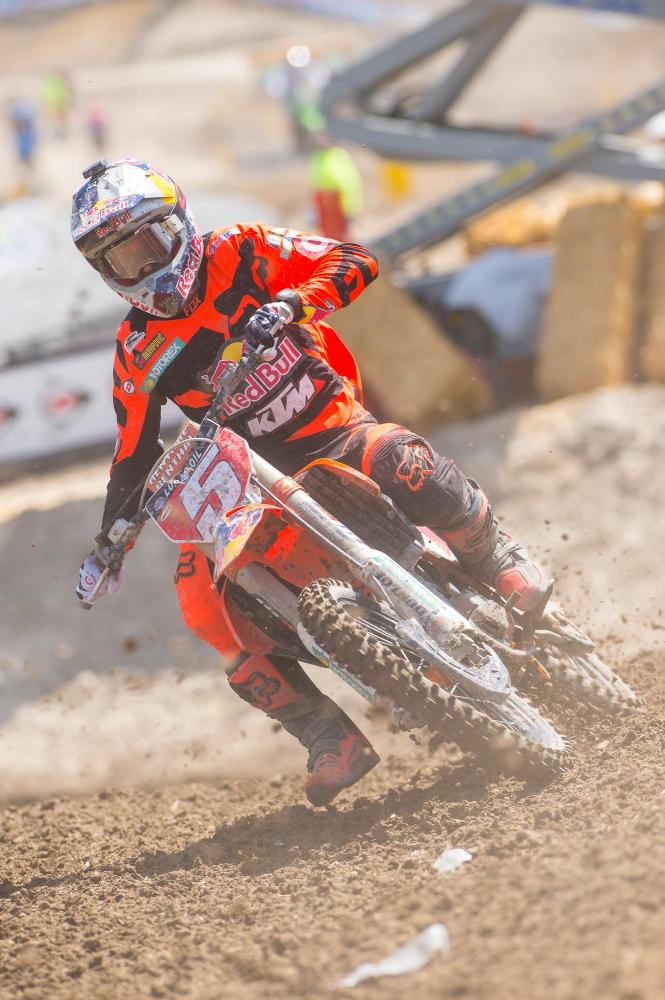 Even without the drama of team orders, fictional or not, there was still plenty happening in the 250 National Championship. Martin got a horrible start in the first moto when he got trapped behind a fallen Joey Savatgy, but streaked from outside the top thirty into fourth. Martin admitted this was partially his fault, because he had the first gate pick thanks to earning the Bud Light Fast Qualifier Award, but he selected the very inside gate and quickly got pinched off and then trapped behind Savatgy. He was gifted with third place when RJ Hampshire went down exiting the final turn on the final lap. If that wasn’t enough, there was a restart in the second moto when Tevin Tapia went down hard and Martin saw his holeshot turn into a seventh or eighth-place start while Musquin took full advantage and nabbed the holeshot. You might expect Musquin to be bummed about getting passed by both Webb and Martin after that, but he said he’s not great on this track, so to leave without any damage in the points was actually great for him. Musquin can hold up last year's results at proof: Martin went 1-1 here in 2014, and he went 4-5.