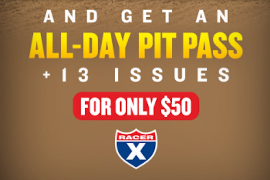 For $50, you get thirteen issues of Racer X Illustrated plus an all-day pit pass. If you're buying more than one pass you can get a multi-year subscription, or you can give the subscription as a gift. This offer is good for both new and renewing subscribers. (For your convenience, the full purchase price includes the Racer X All-Day Pit Pass and the required GA ticket.)