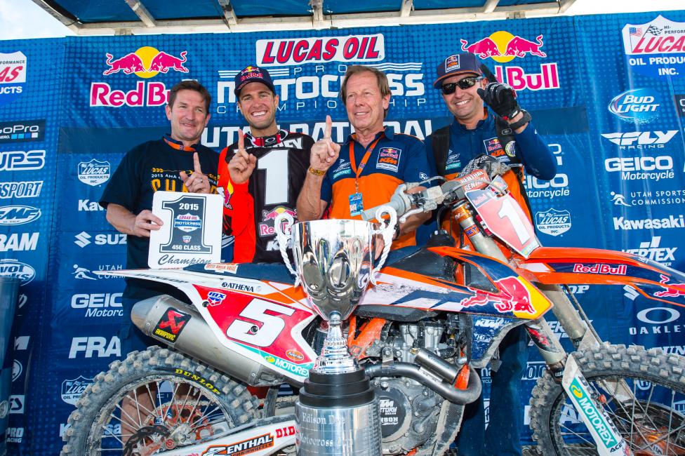 Ryan Dungey: Absolutely. Let alone making it to the pros in the first place, which was the first dream come true. To be a champion is a lot of hard work, a lot of effort, and a lot of years of preparation. You have to have a solid foundation and good group of people around you, from my wife, my family, and the team. Twenty-four motos, that’s a lot of racing, and one little hiccup can cost you a lot of points. Having a good mechanic is key, too. To be able to wrap up the supercross championship was awesome, but to get the national championship in the same year was awesome. The last time I did that was in 2010, and it was an awesome feeling, but this one is even more special. I really feel like we earned it, and we really pushed to be here. The addition of Aldon Baker was a big step forward, and the new bike was great too. There were a lot of good things, and there’s one race left, so we’re going to keep on it.