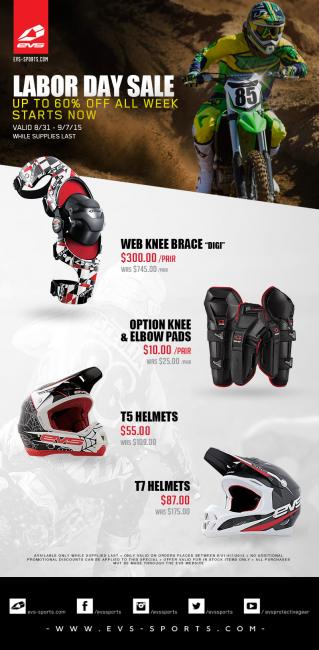 Visit EVS-Sports.com now through Monday, September 7, to get up to 60 percent off your order of EVS braces, guards, and helmets.