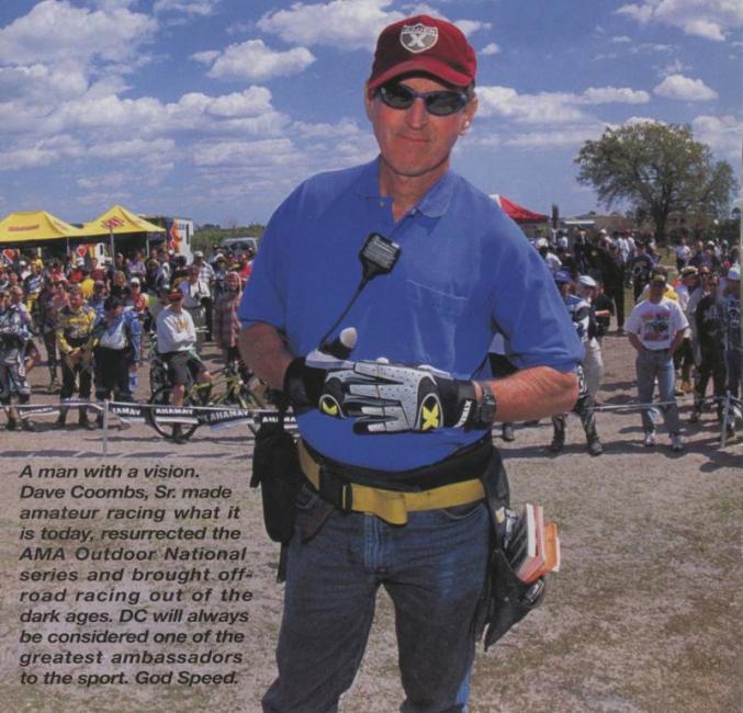 As professional motocross privateer-turned-event-promoter, Big Dave Coombs was the co-founder of not only High Point Raceway and Steel City Raceway, but the AMA Amateur National Motocross Championships at Loretta Lynn Ranch, the Grand National Cross Country Series (GNCC), the National Promoters Group (NPG), the ATV Motocross National Championship, the fabled Blackwater 100, and much, much more. His legacy extended to the foundation of MX Sports Pro Racing, organizers of the Lucas Oil Pro Motocross Championship, as well as Racer Productions, Racer X Illustrated and Racer X Online. Big Dave Coombs passed on August 3, 1998 after losing his battle with leukemia. He was 57 years old.