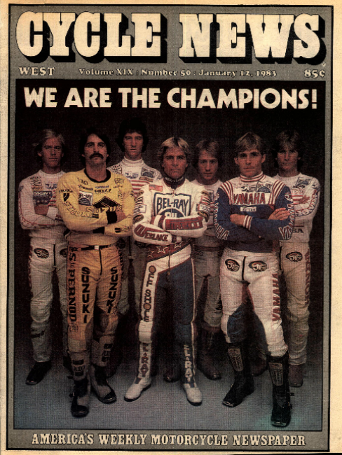 For their efforts, Team USA’s Chandler, Bailey, O’Mara, and Gibson would all be named Cycle News’ Riders of the Year, along with 500cc World Champ Lackey and 250cc World Champ LaPorte, plus World Speedway Champion Bruce Penhall. Photographer Yoshi Ohara was the shooter of what became an iconic cover.