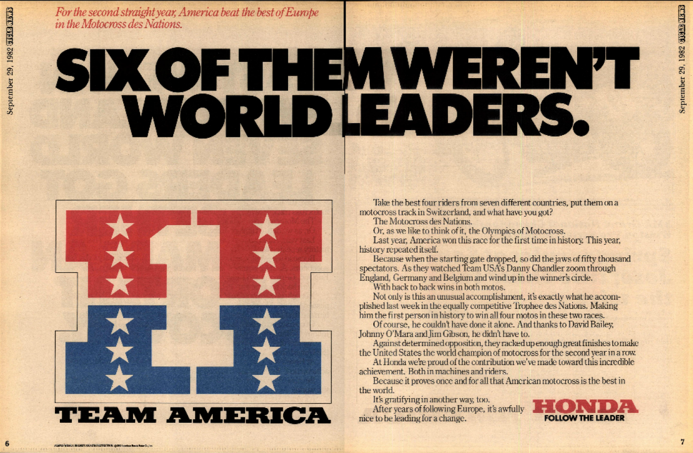 The world-shaking victories of Team USA at the 1981 Trophee (250cc) and Motocross (500cc) des Nations gave American motocross a huge shot in the arm, and that was only the beginning of the revolution. By the end of summer in 1982, Brad Lackey was the first American to win an FIM 500cc World Champion, and three weeks later Danny LaPorte, one of the previous year’s Team USA riders, would clinch the 250cc crown after switching to Yamaha and moving to Europe. And even though other riders now wanted to go, the AMA decided to allow American Honda to once again field a team of red riders.