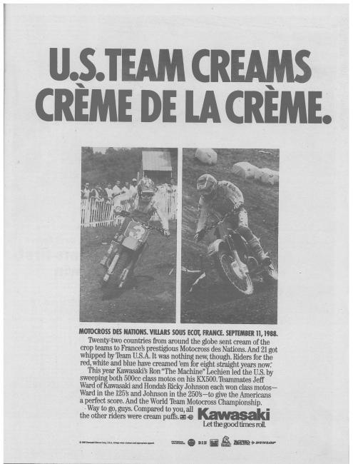 Johnson, the 1988 AMA Supercross and 500cc Motocross Champion, would lead the charge on a 250 Honda. Jeff Ward, the ’88 250cc Motocross Champion, would drop down to ride a Kawasaki KX125. That’s because DeCoster and the AMA decided the Americans would have a better chance with Ron Lechien as the third man on a 500, as compared to ’88 AMA 125 Motocross Champion George Holland joining the team on a 125 and Wardy riding the 500. In other words, for the third year in a row, DeCoster left the 125 champ home—even though all three times (Micky Dymond twice and Holland once) they were his own American Honda riders.