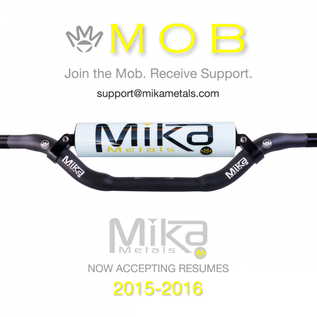 Mika Metals is officially opening its 2016 sponsorship season. Join our elite team and start using our complete line of racing products that includes handlebars, chains, brake pads, sprockets, and much more. Support riders will use mikametals.com to place orders online. Email your resume to support@mikametals.com or apply through Hookit and become part of our team.