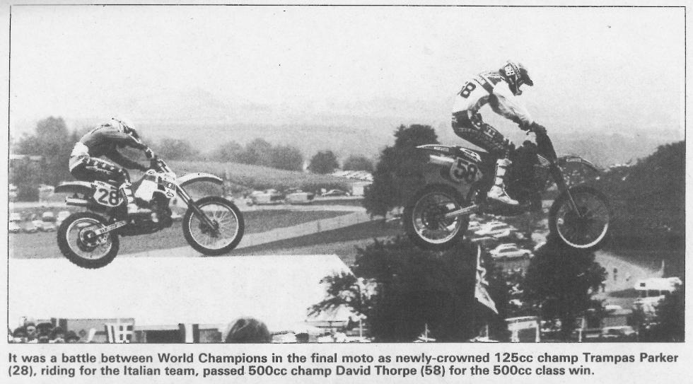 Just as it was the year before in France, Team USA had clinched the Motocross des Nations at the conclusion of the second moto. As a formality, the third and final was run and Stanton won it in a waltz. Ward struggled and let both his teammate Stanton and Thorpe go, the war won. Thorpe appeared to have the runner-up position covered, but yet another American, newly crowned 125cc World Champion Trampas Parker (who was actually riding for Italy, where he lived) deftly zapped him at the end. Just as he had shocked the world by winning the ’89 125cc world title, Parker now shocked everyone again by showing up on a 500cc KTM and beating everyone but Stanton.