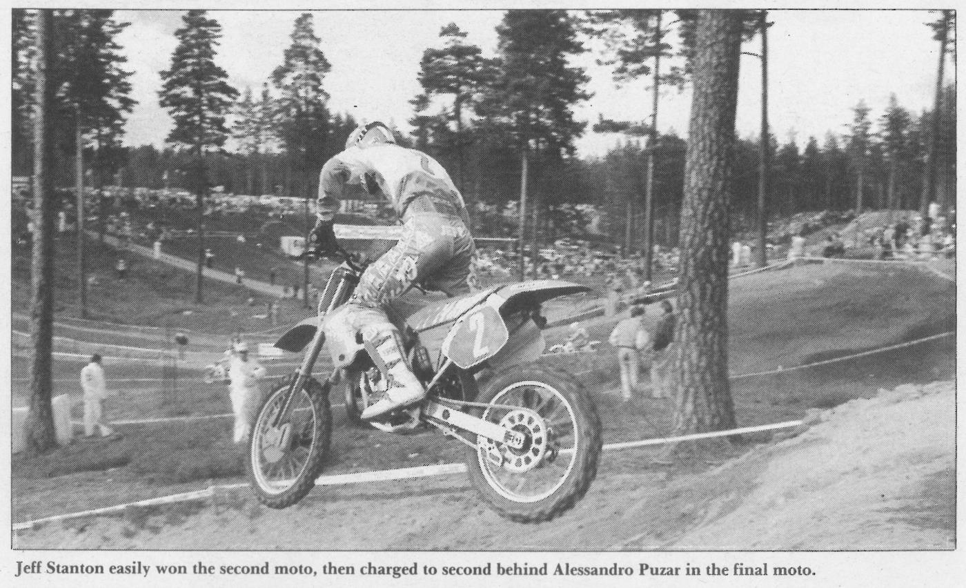 Italian Alex Puzar led the moto aboard his works Suzuki 250, and behind him were 500cc riders Leisk and that pesky Geukens. Stanton, meanwhile, rode like a man possessed, ripping and tearing his way toward the front. At the halfway mark he was up to fifth, and soon thereafter, zapped Johansson and Finnish rider Pekka Vehkonen. Next up was the Belgian Geukens. Upon closing in on the American nemesis, the battling duo disappeared into the track's back section. Then, while all the fans waited for the duo to come back into view, Stanton was all alone. A collective gasp went up. Where was Geukens? Stanton, smirking under his helmet, had the answer.